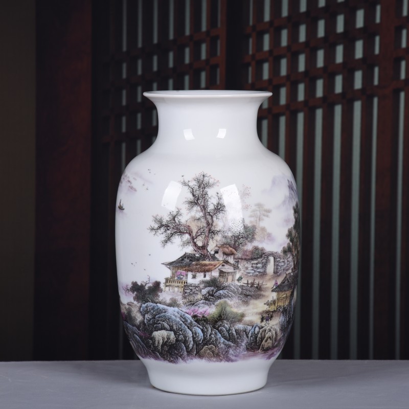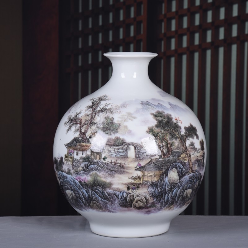 景德镇陶瓷器花瓶干花插花山水画摆件新中式石榴瓶家居客厅博古架
