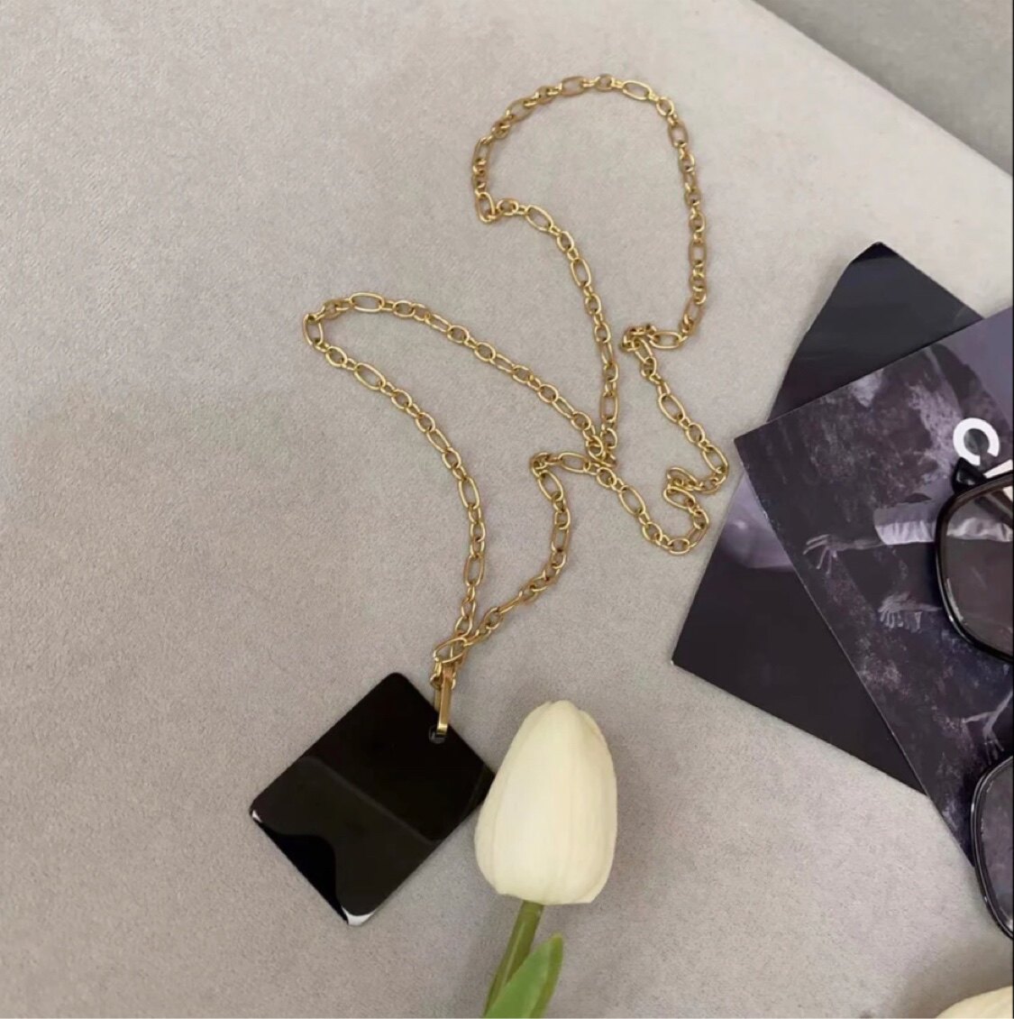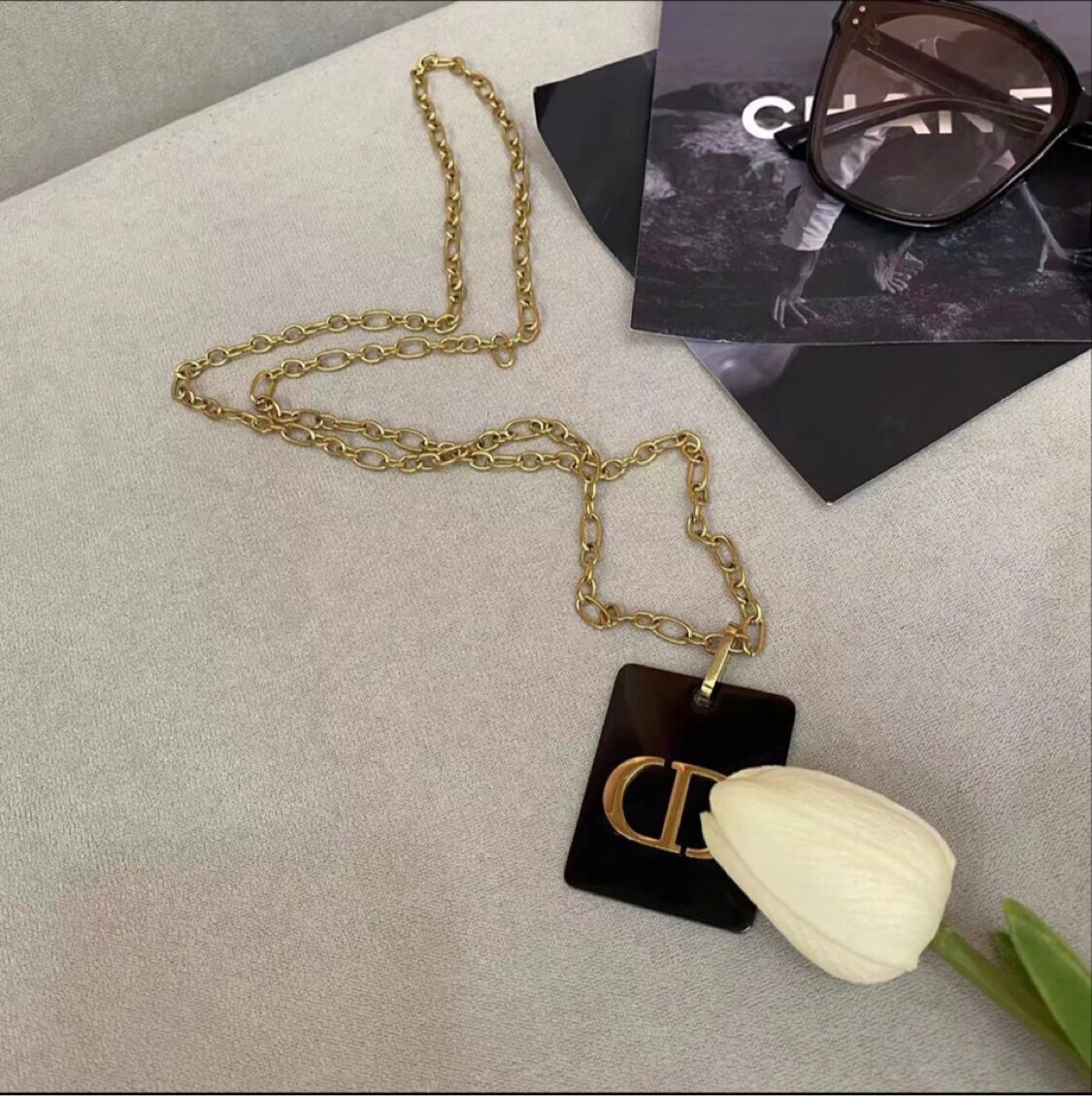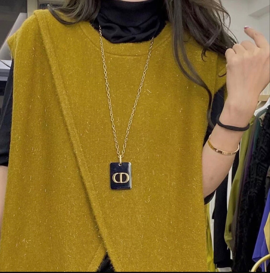 欧货黑色方牌字母CD毛衣链网红推荐时尚百搭穿搭项链钛钢保色饰品