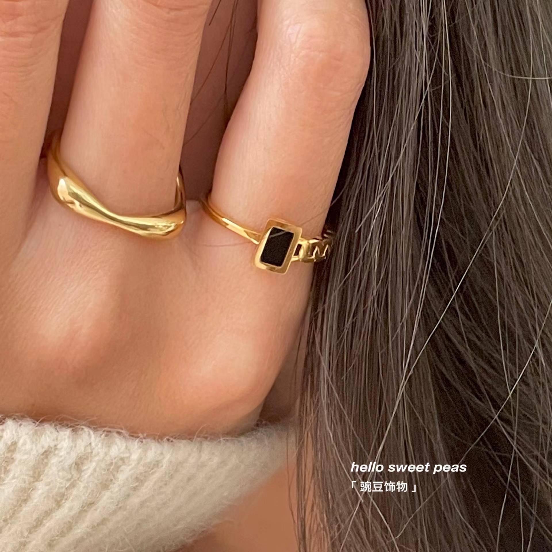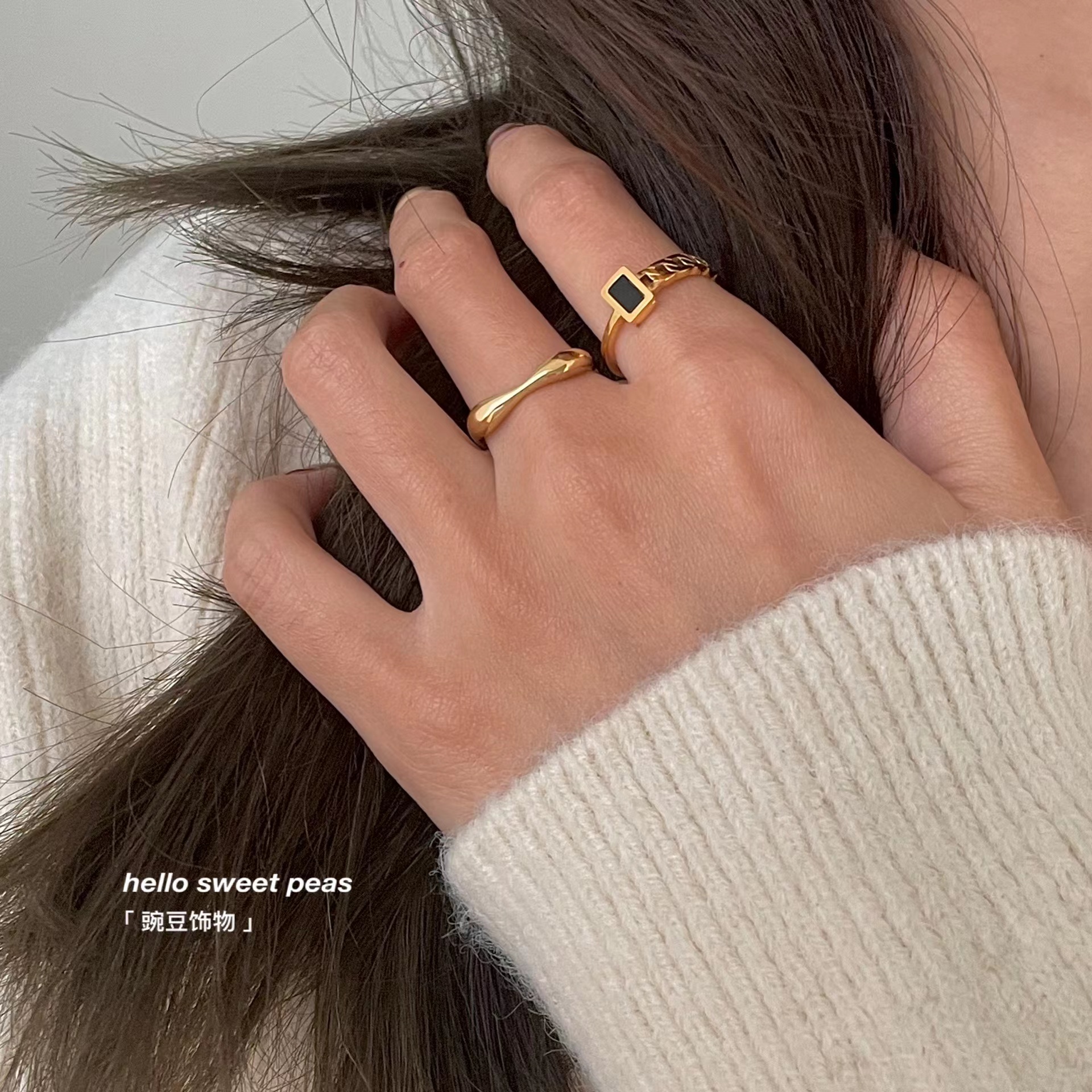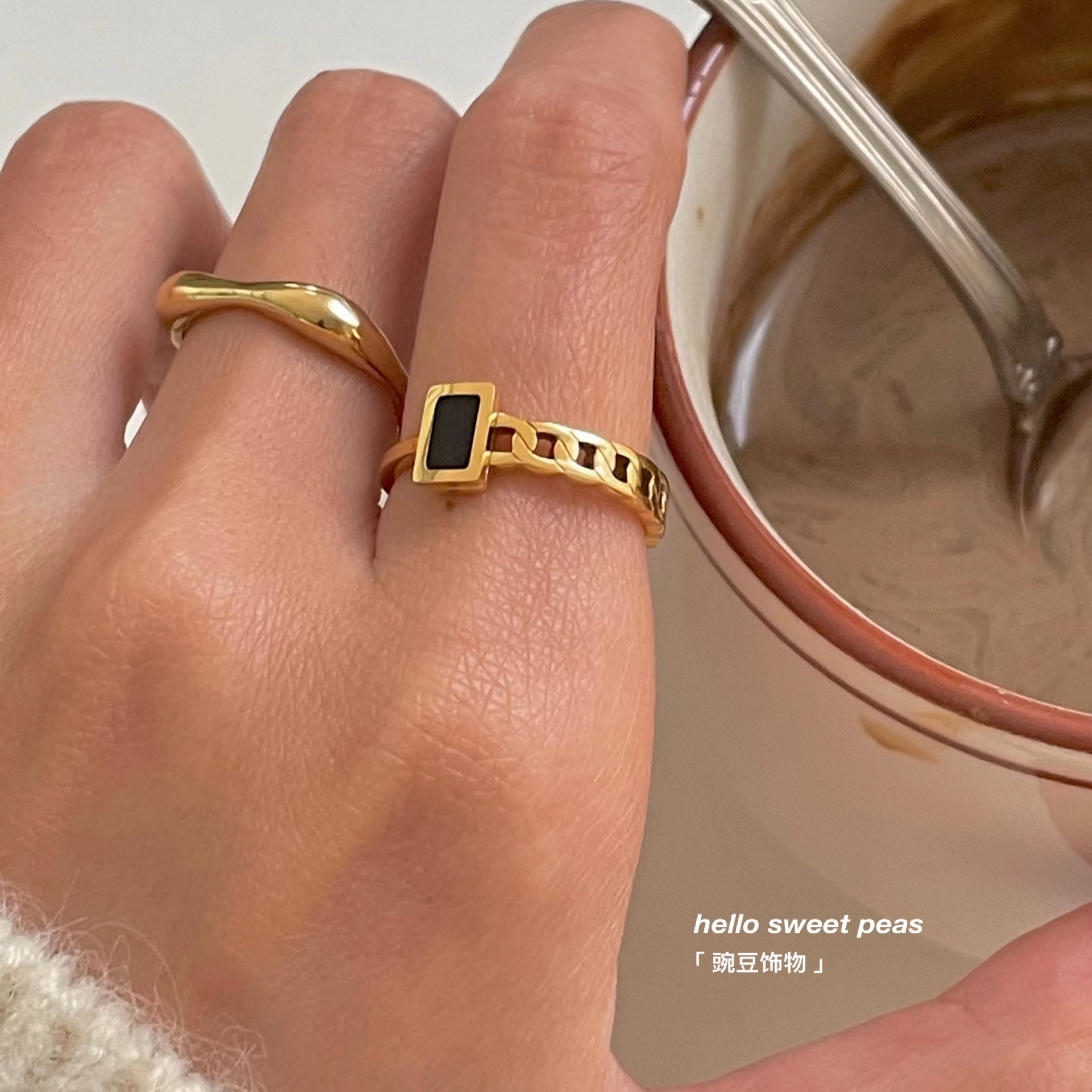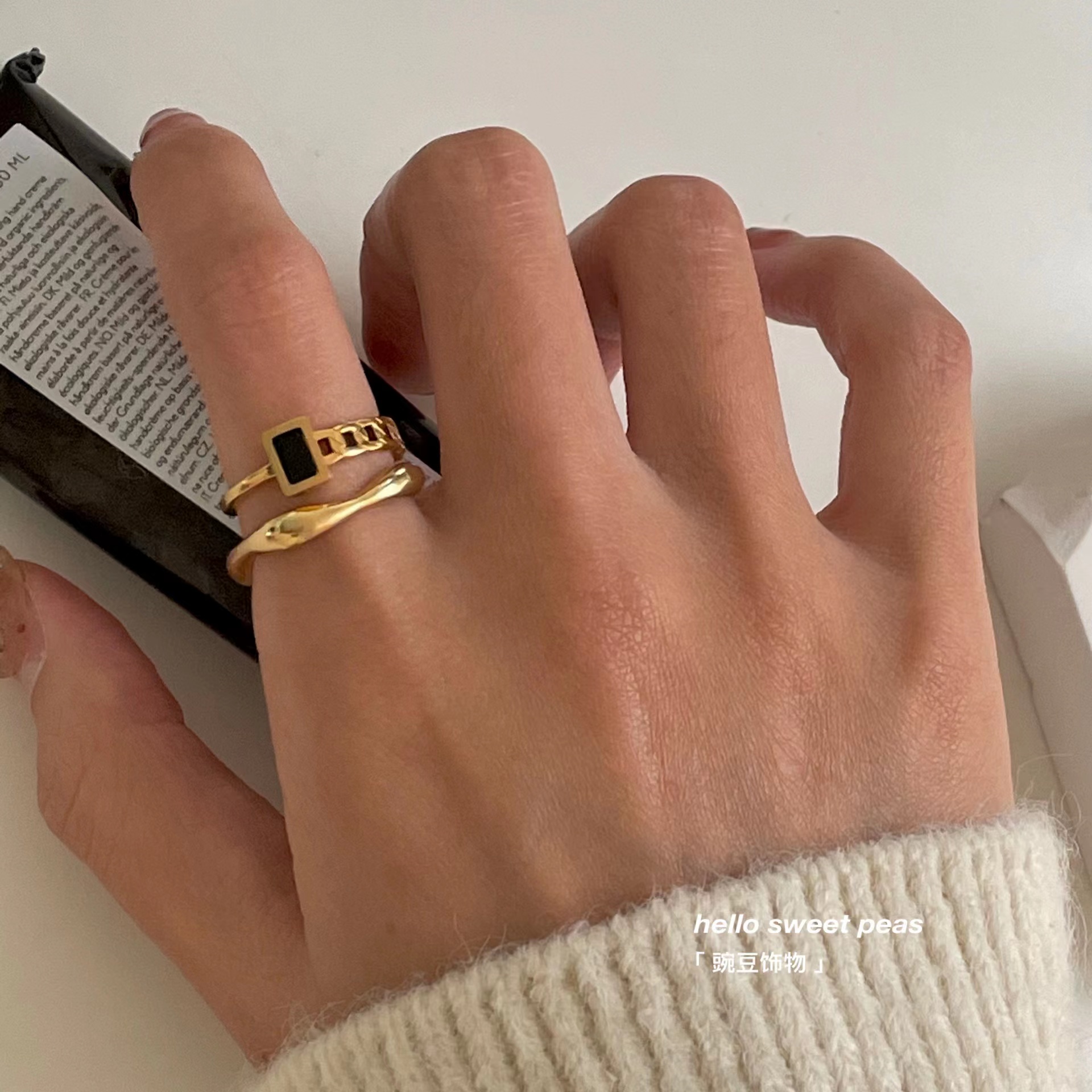 豌豆饰物 不易掉色钛钢小黑方拼接链条戒指ins冷淡风不规则食指戒