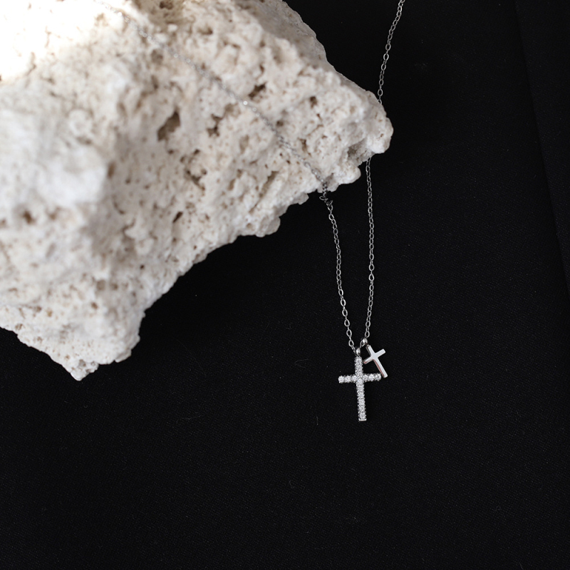 包邮!钛钢银色不掉色女款满钻百搭十字架项链微镶锁骨链 0.01KG