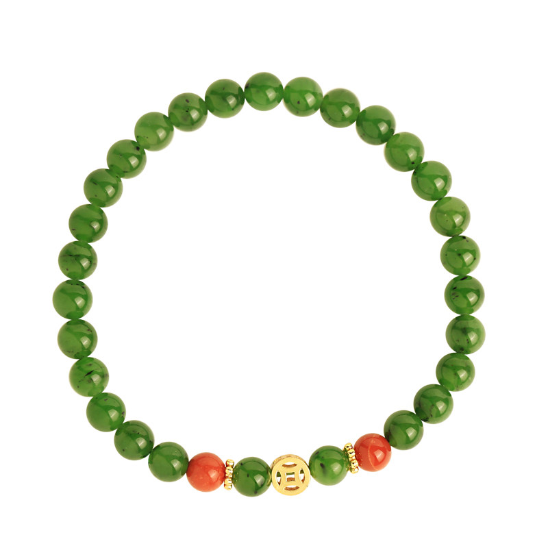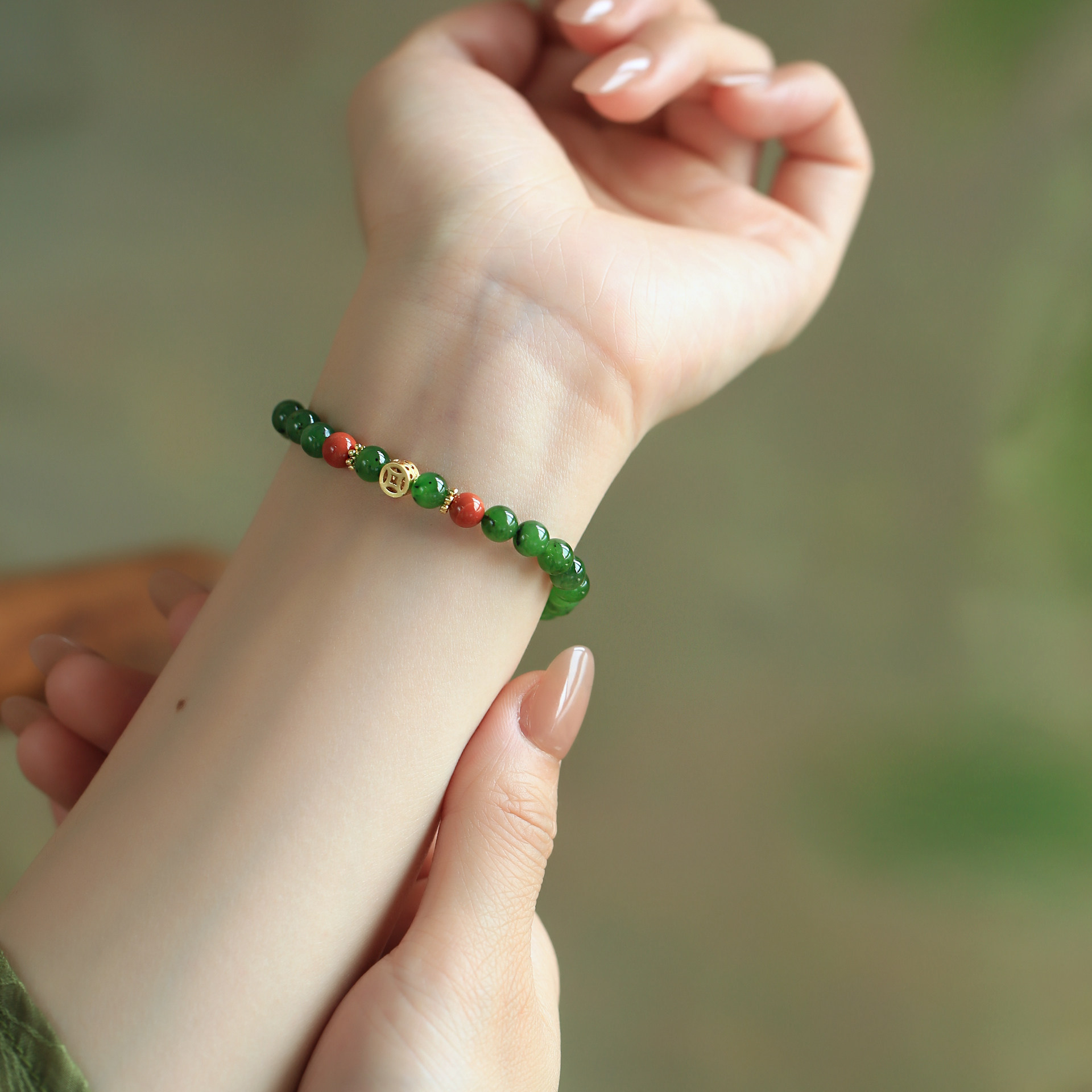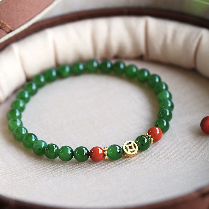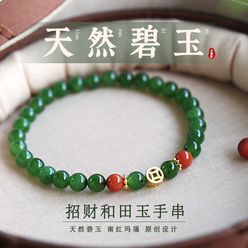 小银匠天然碧玉和田玉纯银钱币手串女款国风绿色玉石串珠水晶手链