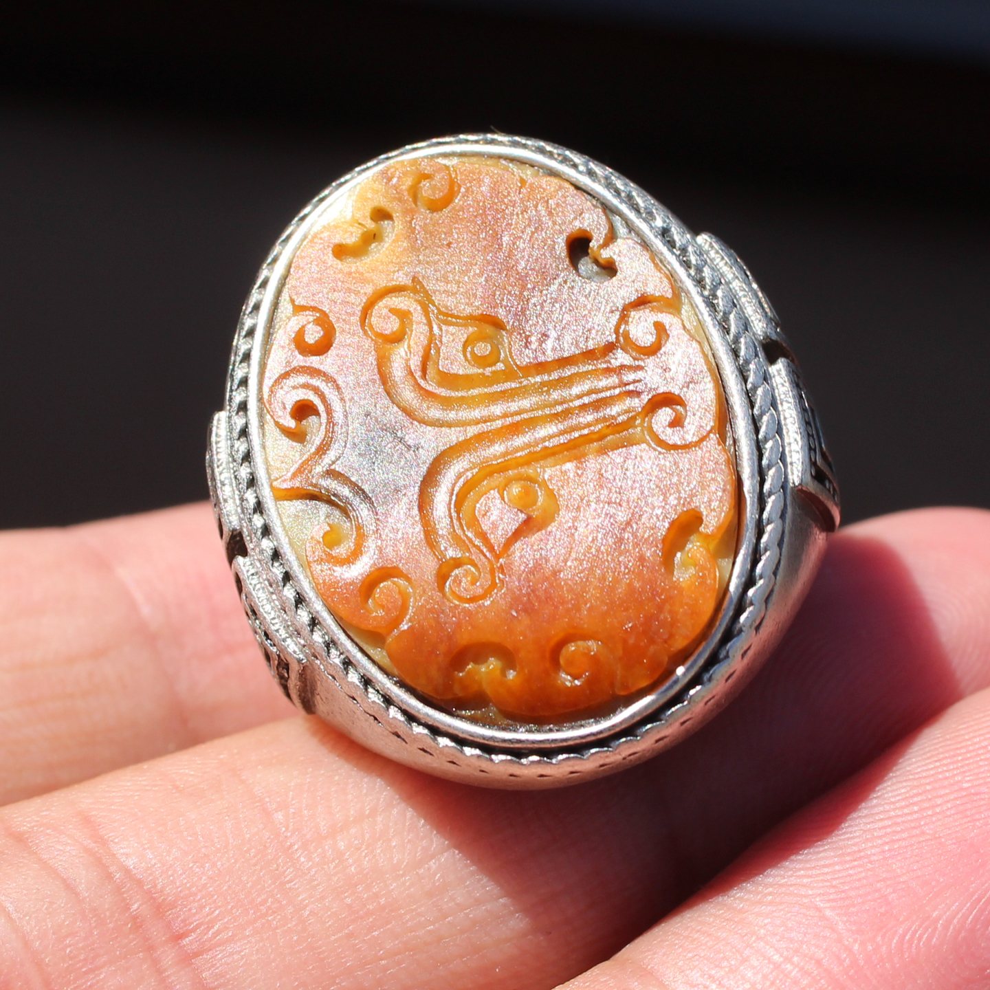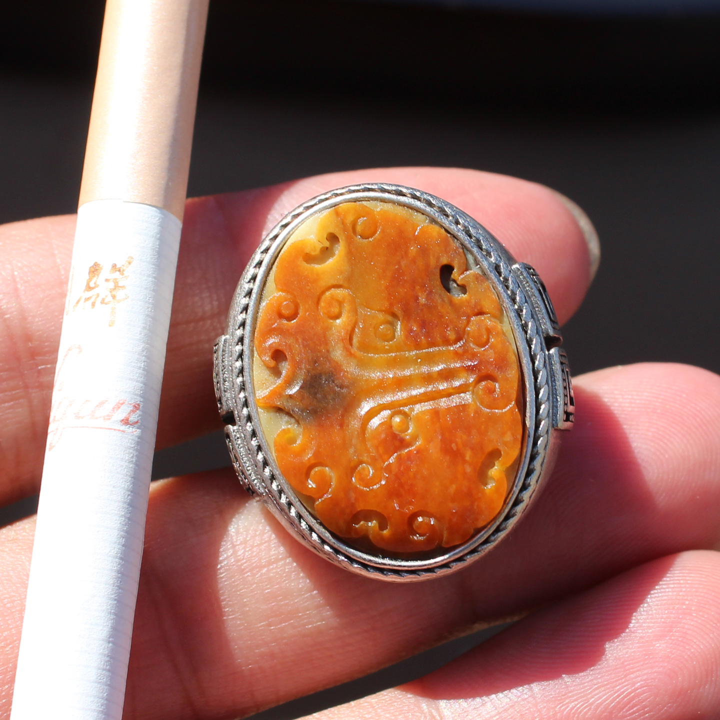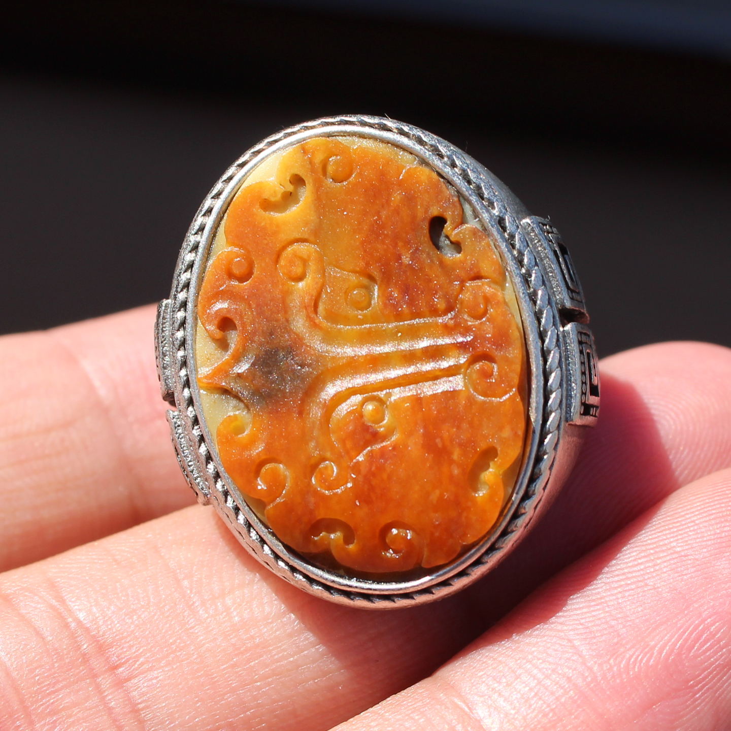 方言和田玉精品新疆黄沁皮和田籽料兽面守护银镶玉原石戒指扳指A1