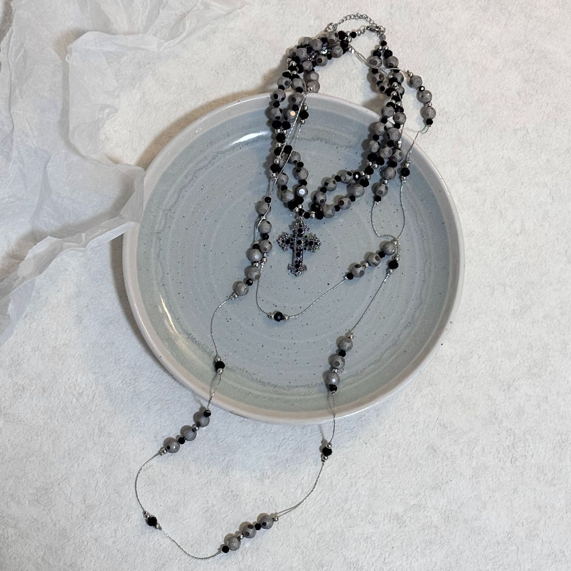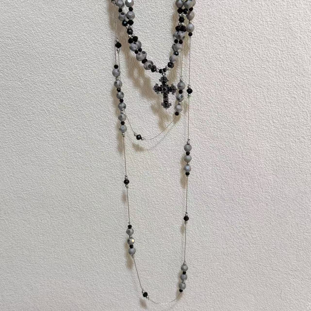 欧美重工Y2K灰色珍珠十字架项链女多层叠戴亚文化废土风毛衣链潮