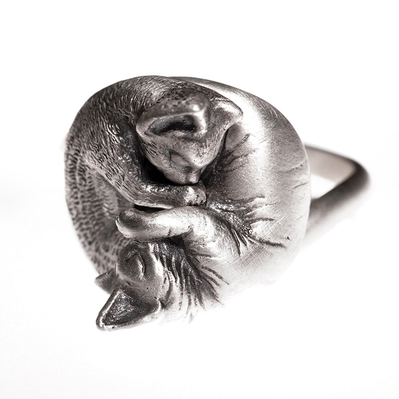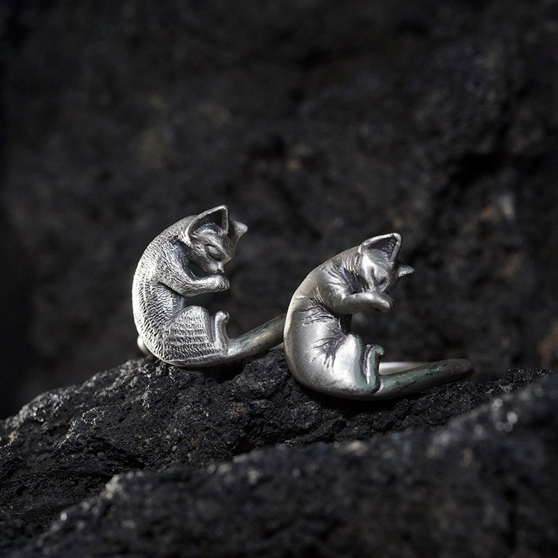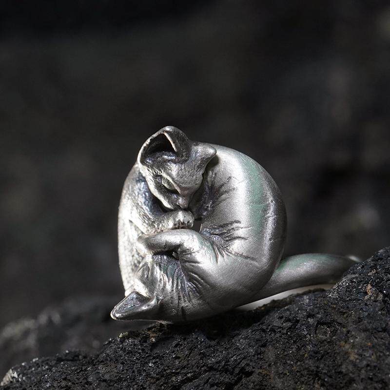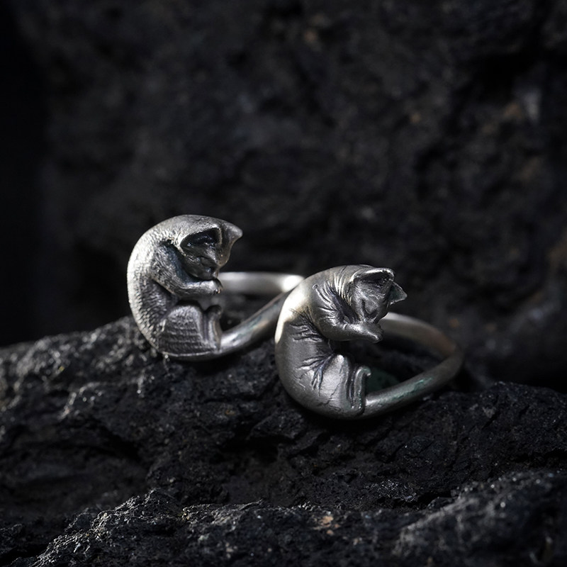 kozoo原创设计环抱戒指925纯银饰宠物先锋指环浮雕甜酷立体德文猫