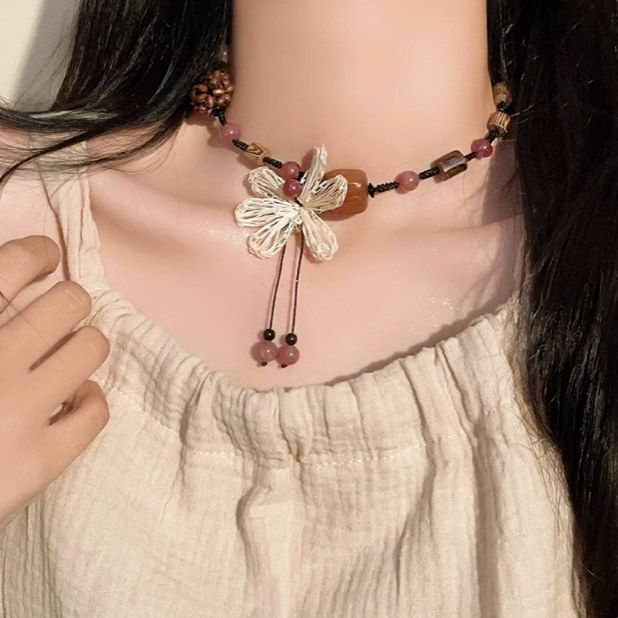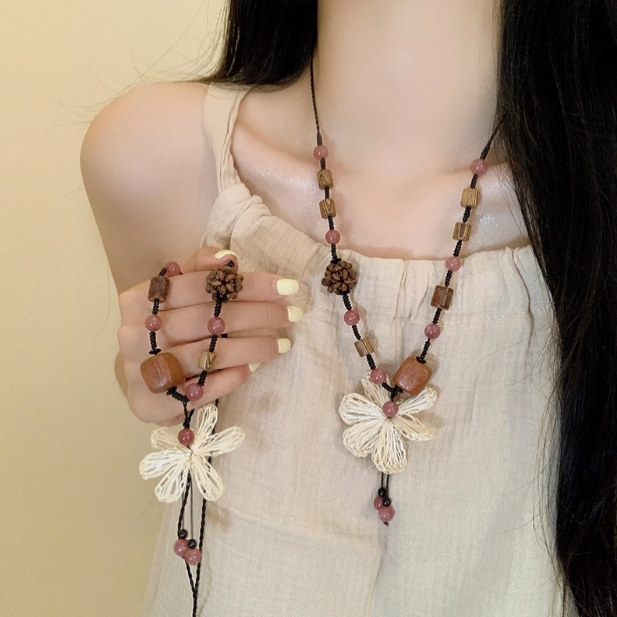 波西米亚风~新中式花朵串珠编织项链女民族风复古长款高级感颈链
