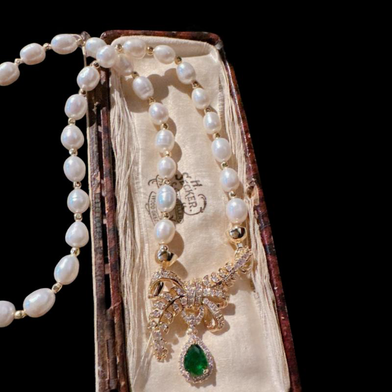 美人鱼的泡泡蝴蝶结宝石珍珠项链大溪地孔雀绿锆石珍珠颈链组合