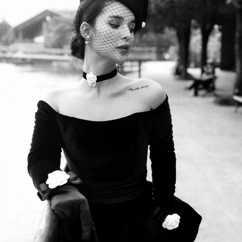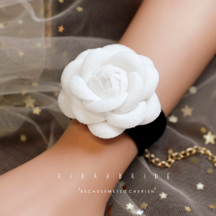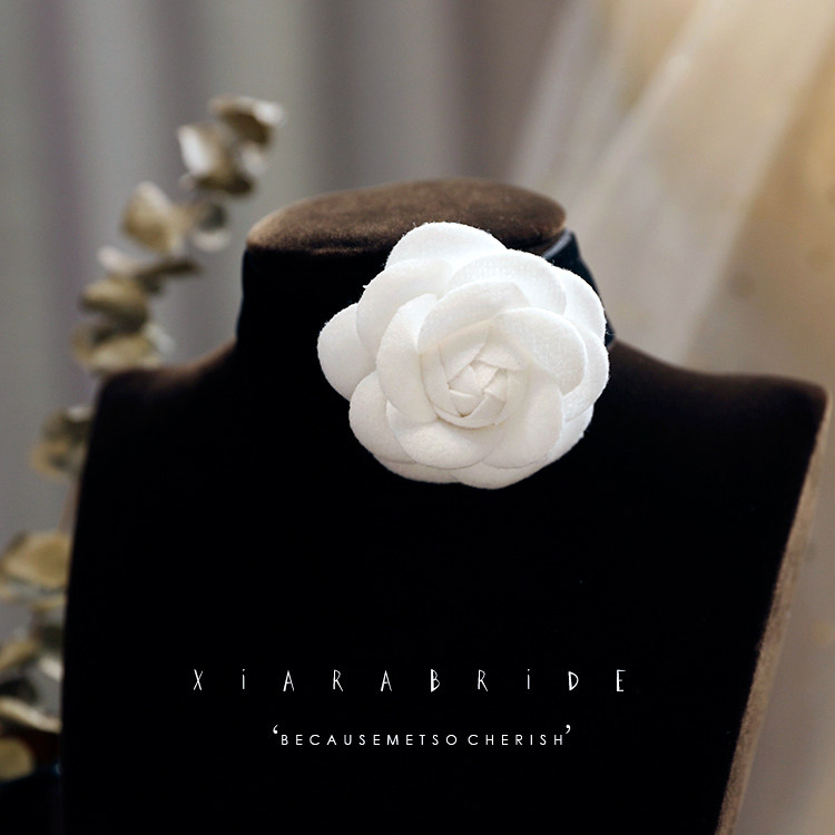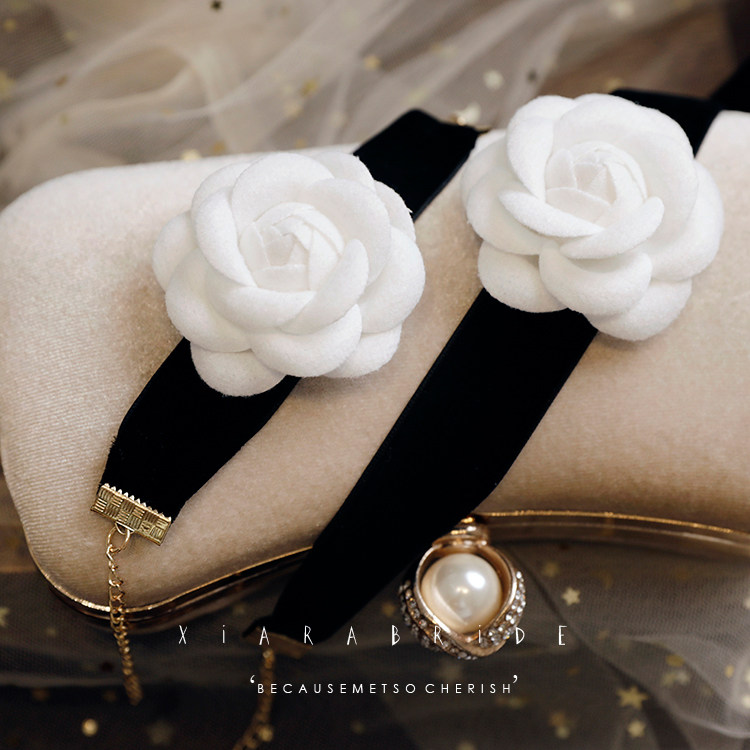 原创小香风茶花朵颈链丝绒黑色手腕花手链礼服晚宴派对年会配饰