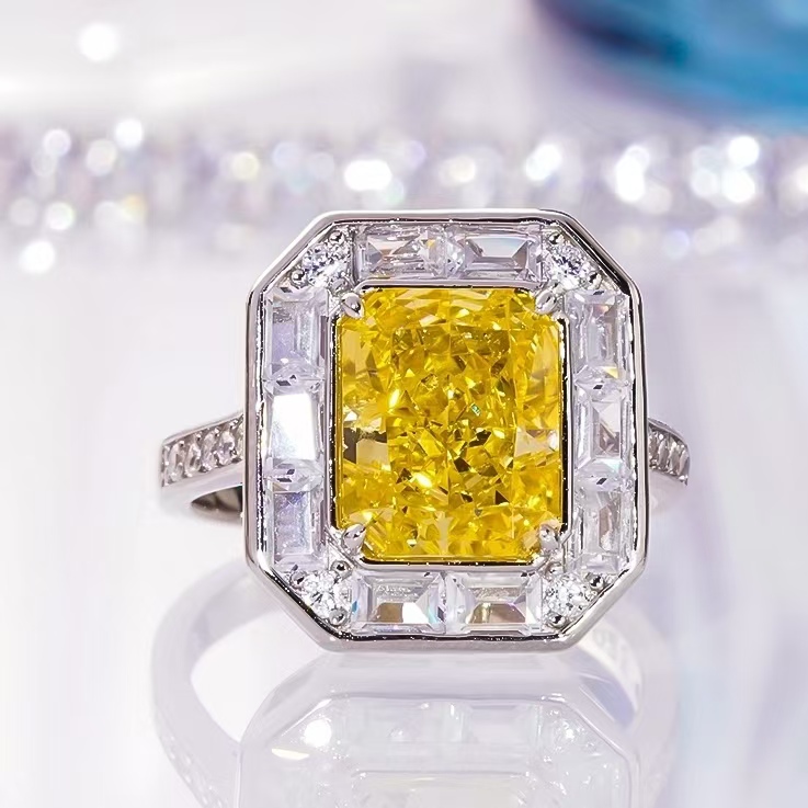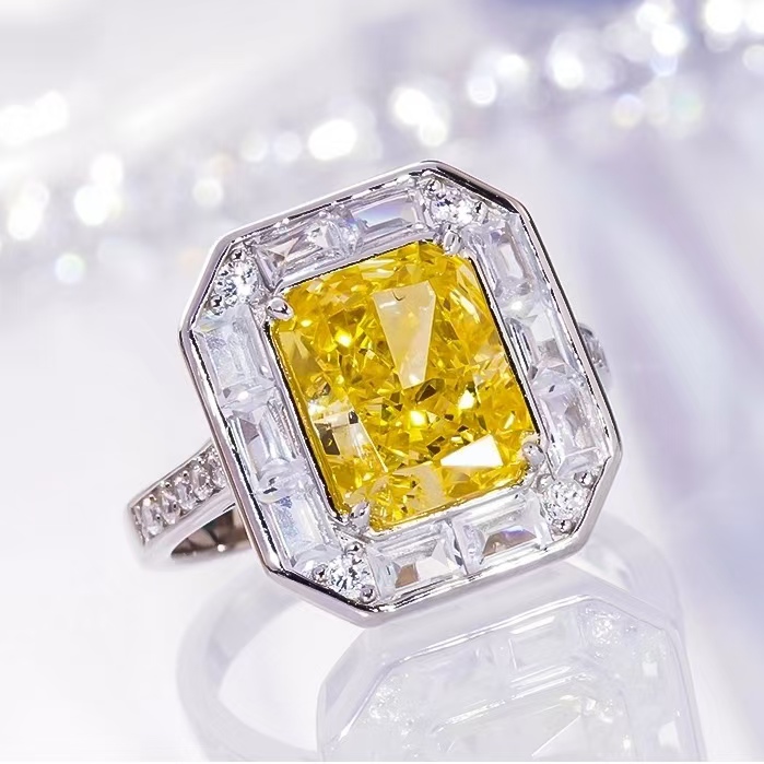 AU750白金莫桑石4克拉黄钻戒指气质纯银时尚奢华精致超闪设计感