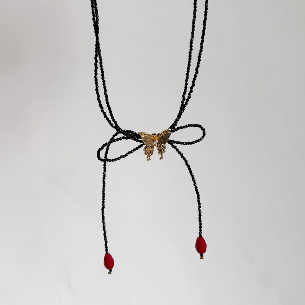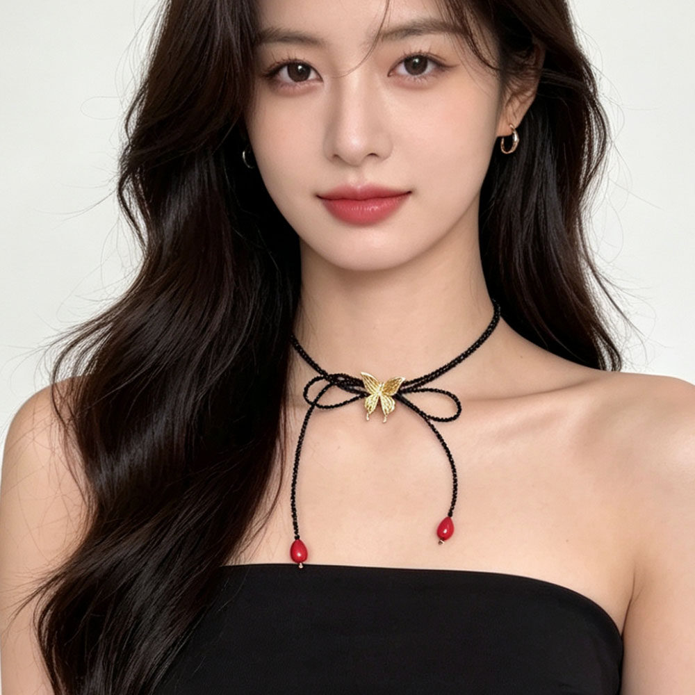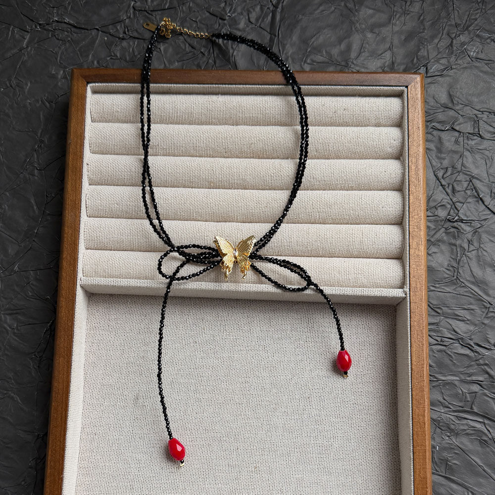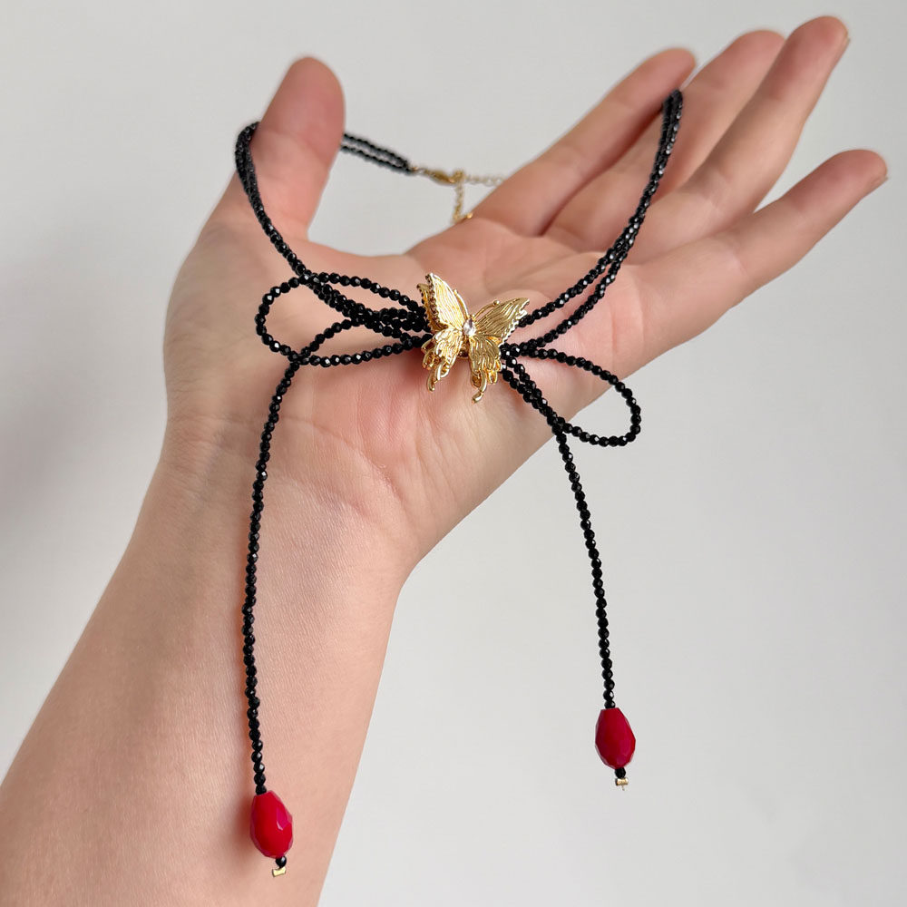 高级感黑色蝴蝶结尖晶石choker项链颈链女款甜辣细闪氛围锁骨链