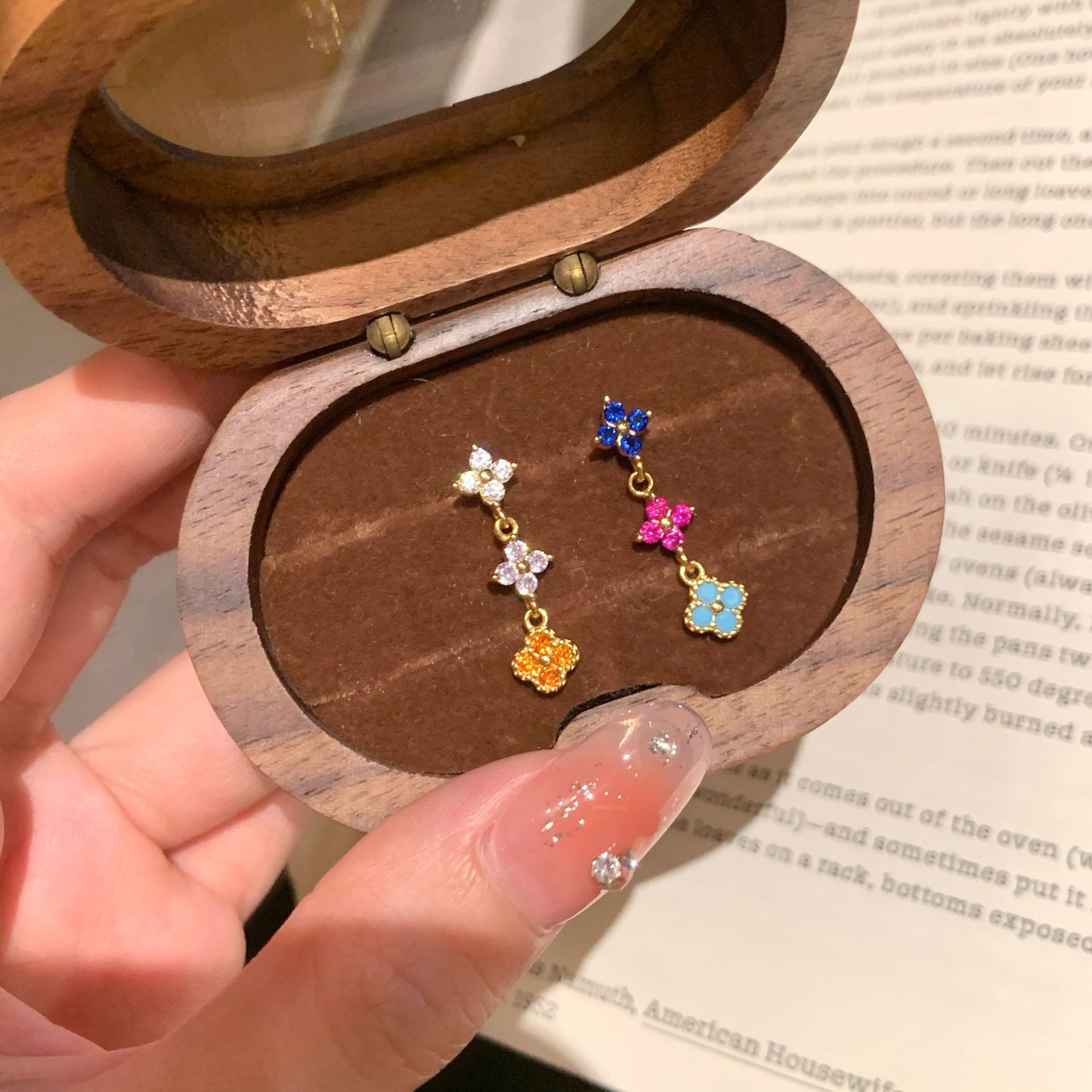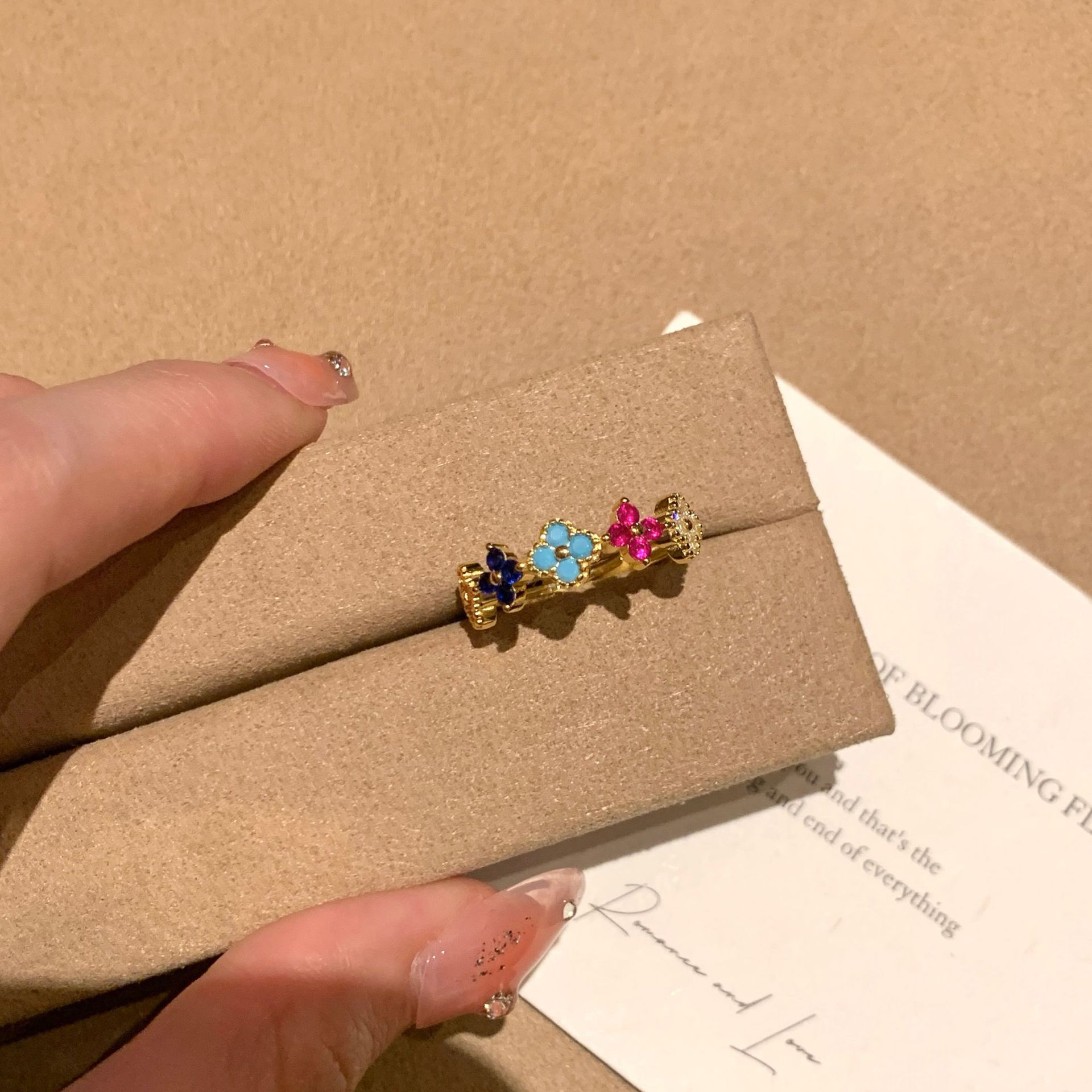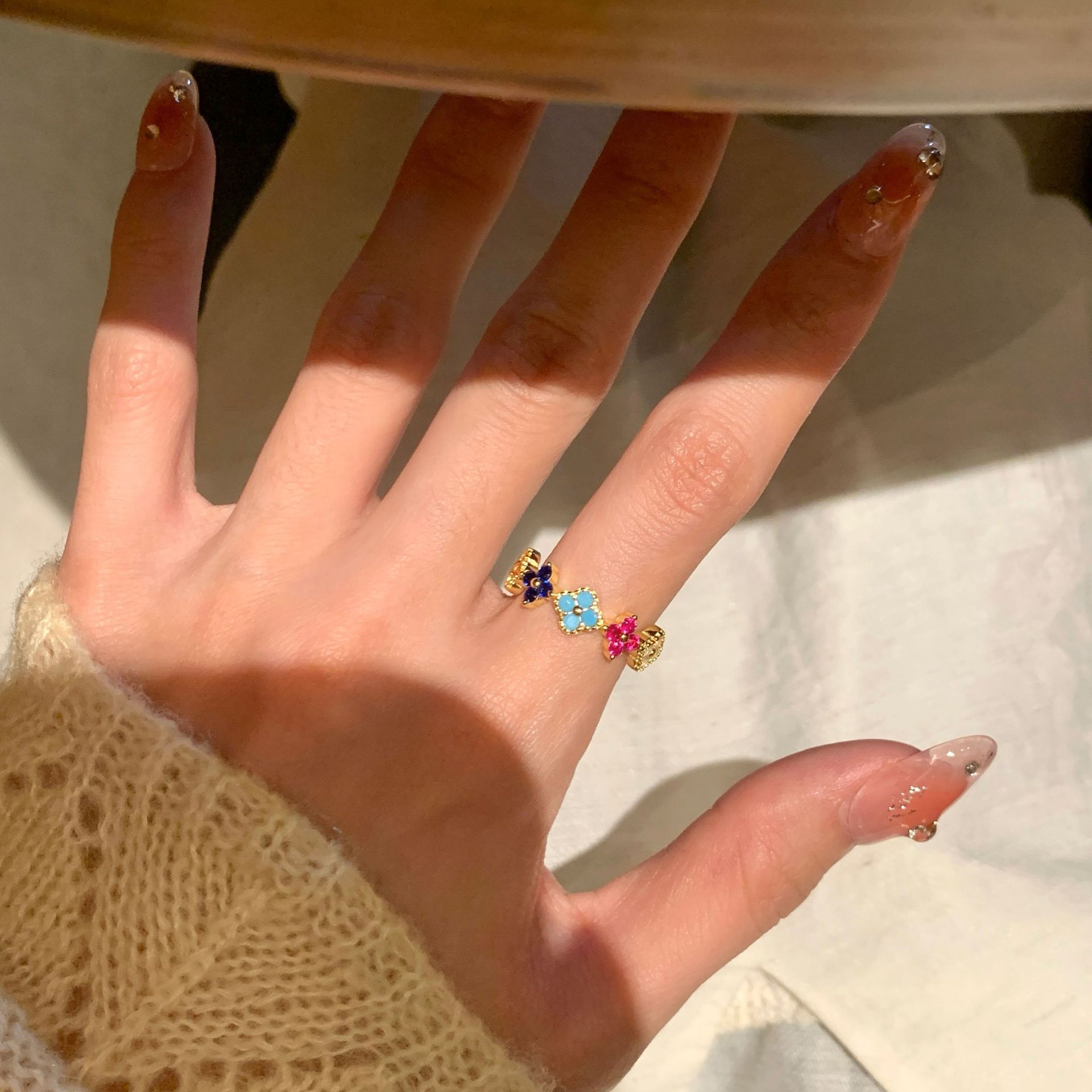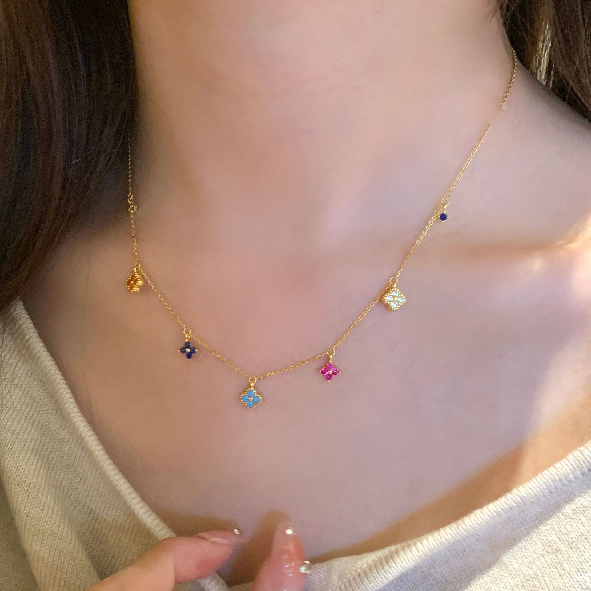 S925纯银彩虹四叶草项链耳钉戒指女中古风小众设计感轻奢套装