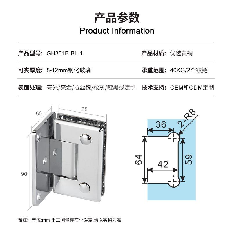 全铜超薄玻璃门淋浴铰链浴室淋浴房无框玻璃门柜铰链GH301B-BL-1