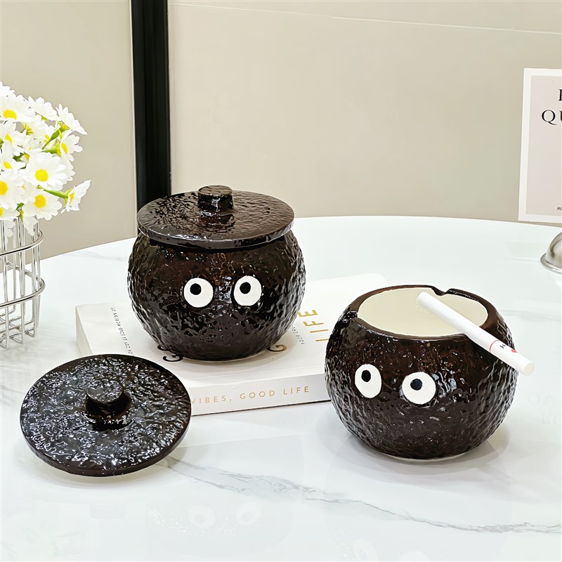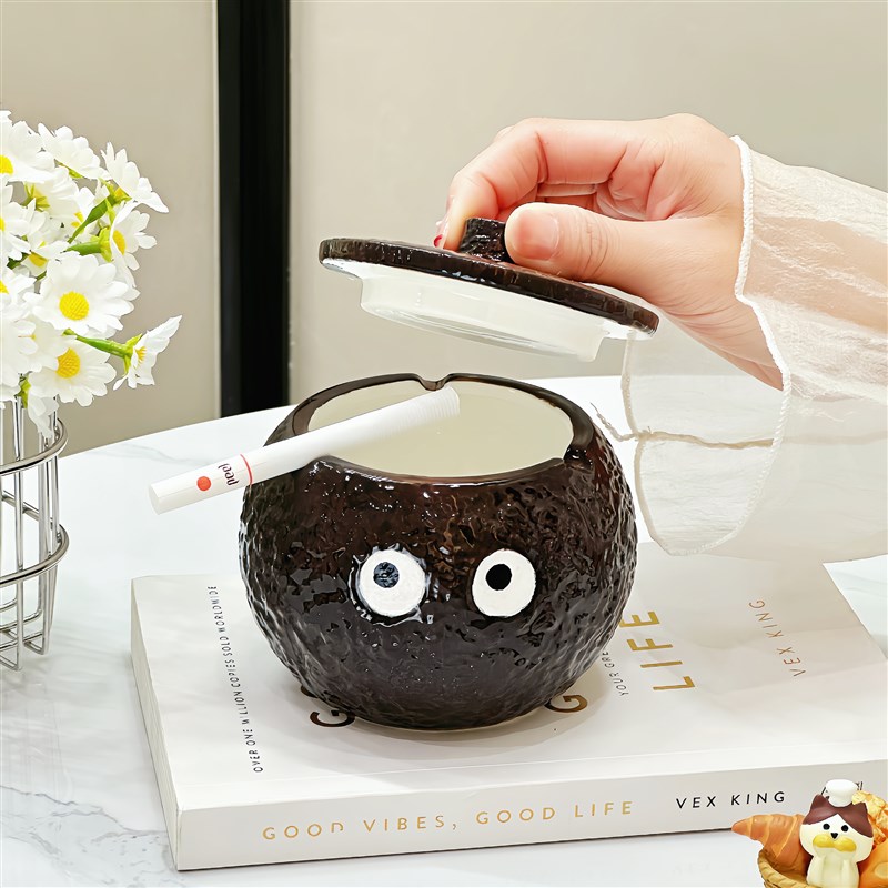 卡通小煤球陶瓷烟灰缸家用客厅办公室带盖防飞灰装饰烟缸桌面摆件