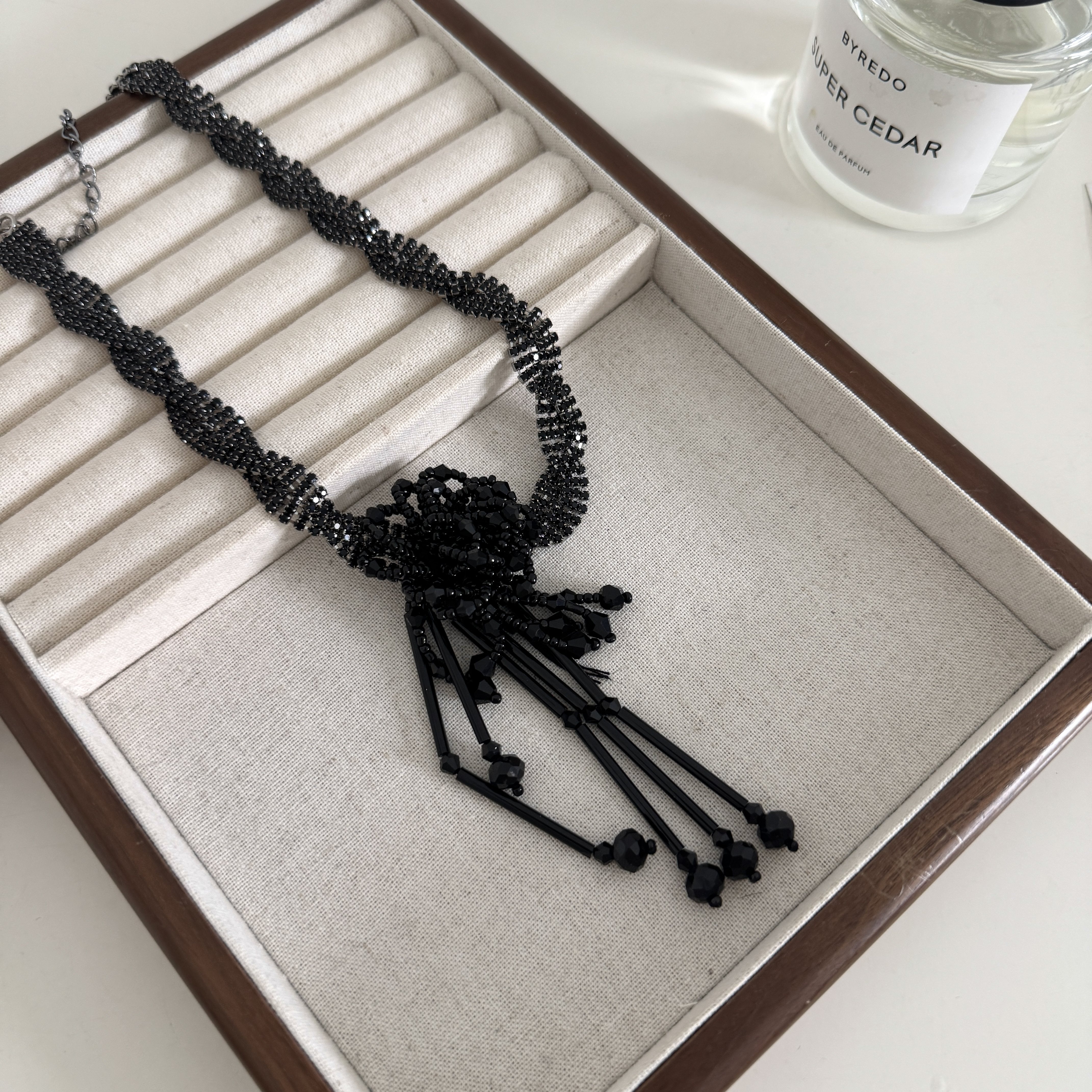 辣妹风黑水晶流苏花朵项链女高级感复古满钻水晶百搭锁骨链颈链
