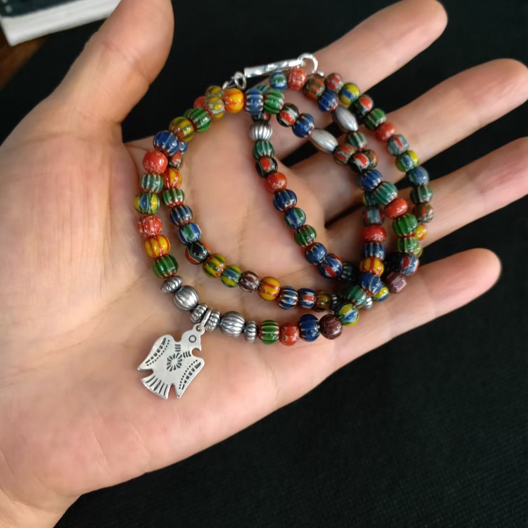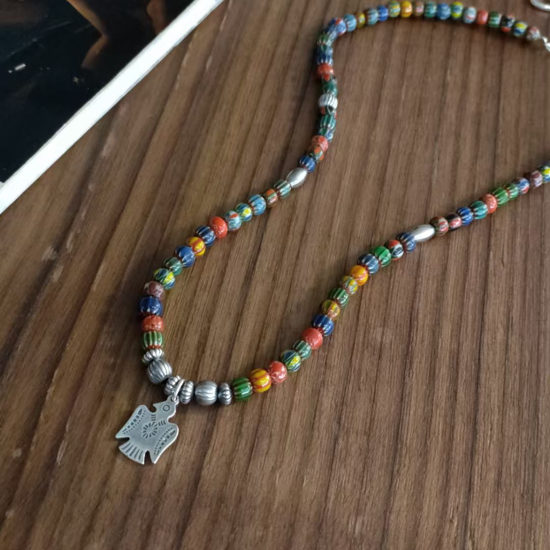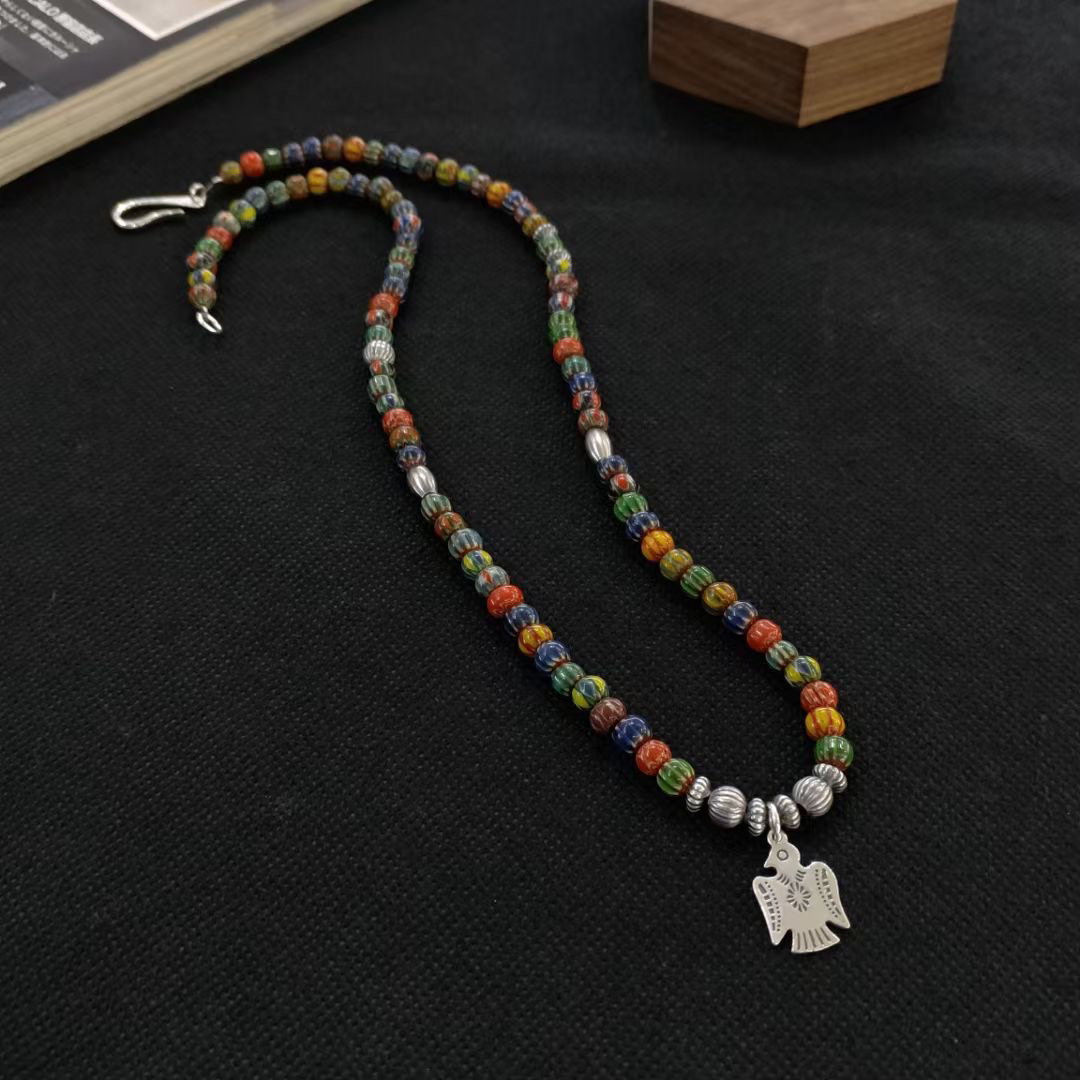 原创小众925纯银做旧印第安人吊坠琉璃珠项链