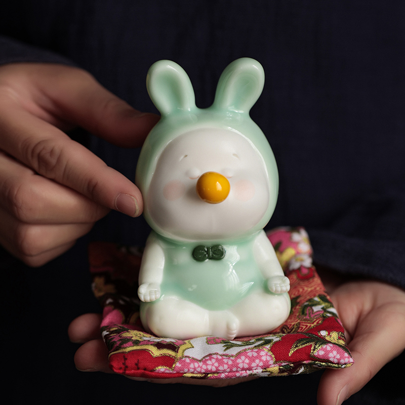 青瓷打坐小兔子摆件可爱俏皮玉兔吉祥物 创意桌面摆设 车载装饰品