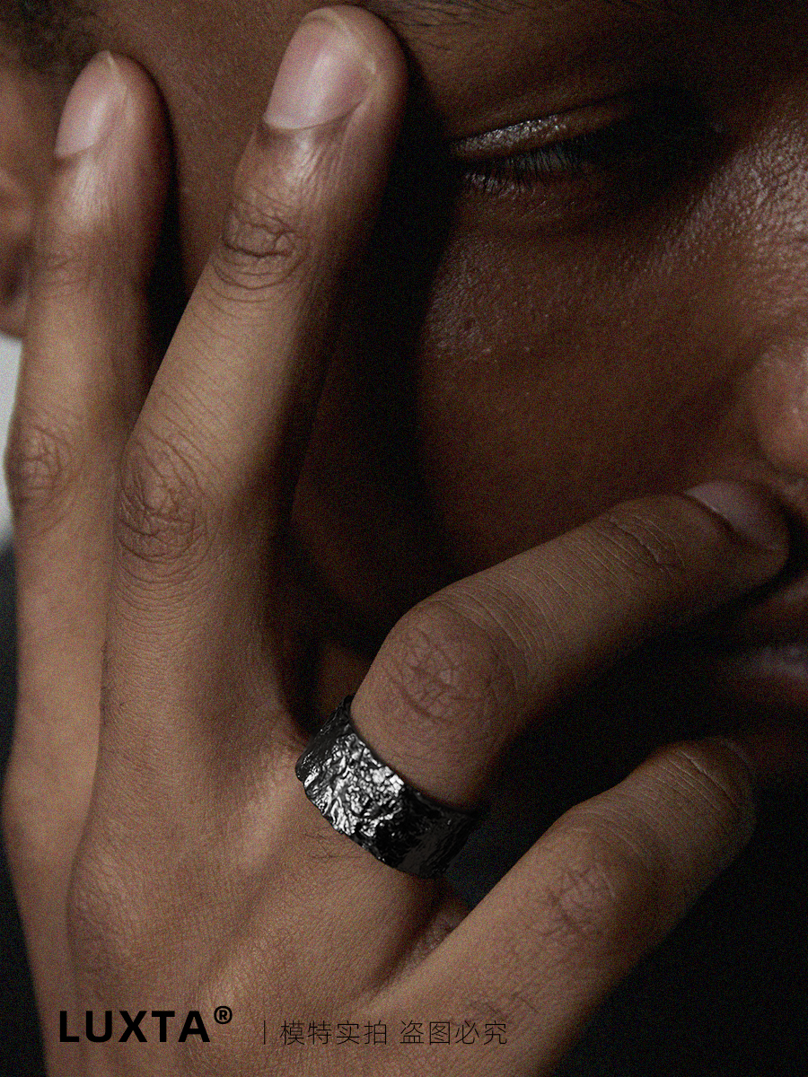 LUXTA s925纯银黑色戒指 嘻哈男指环镀黑金潮牌气质开口可调节