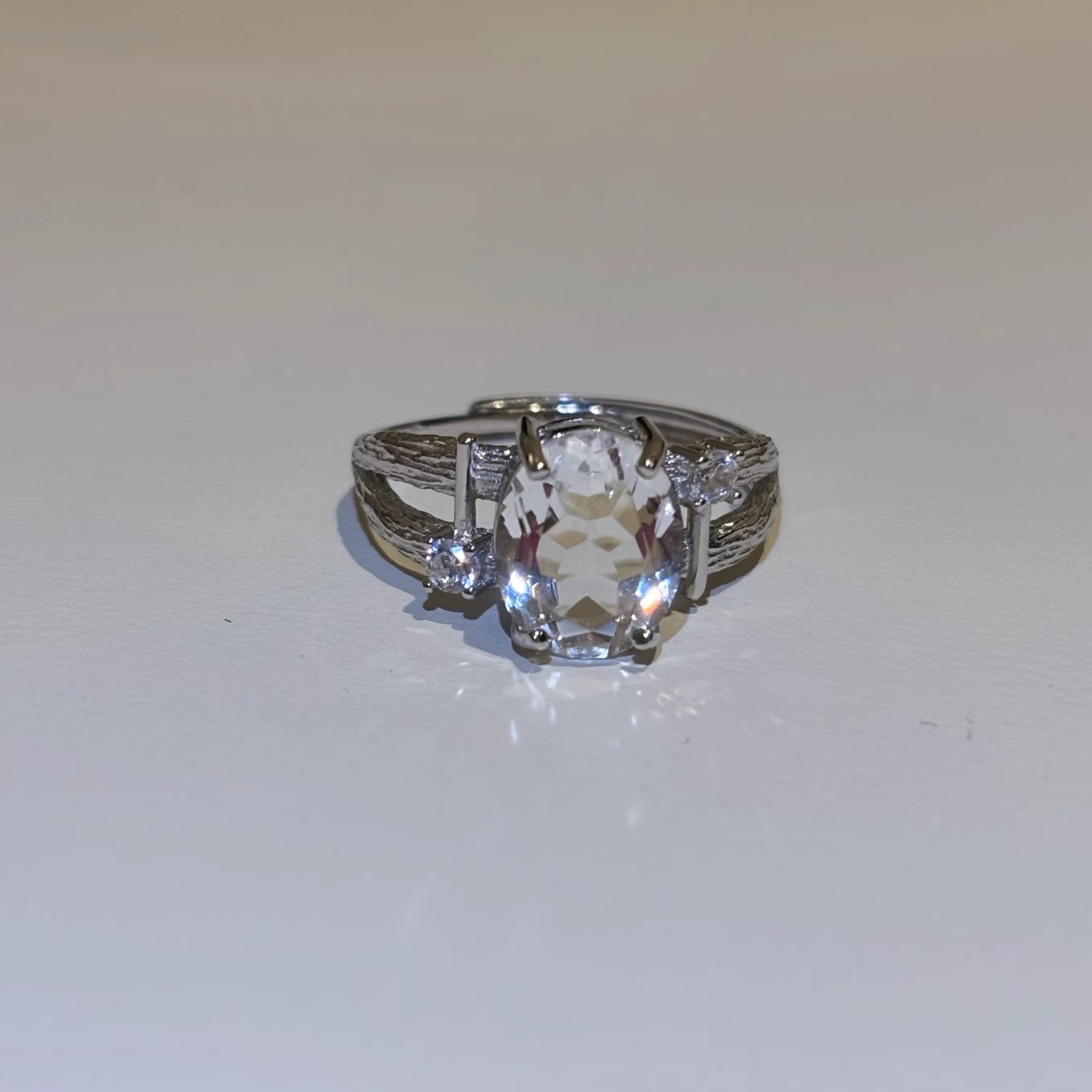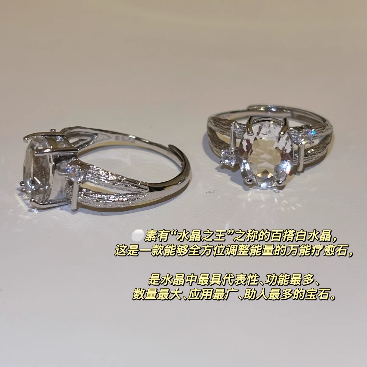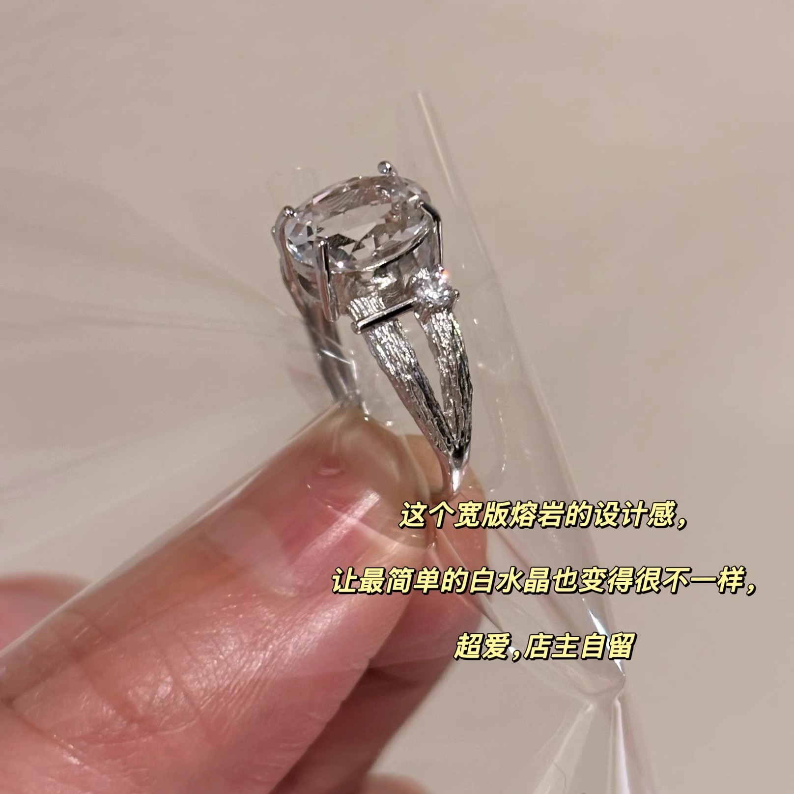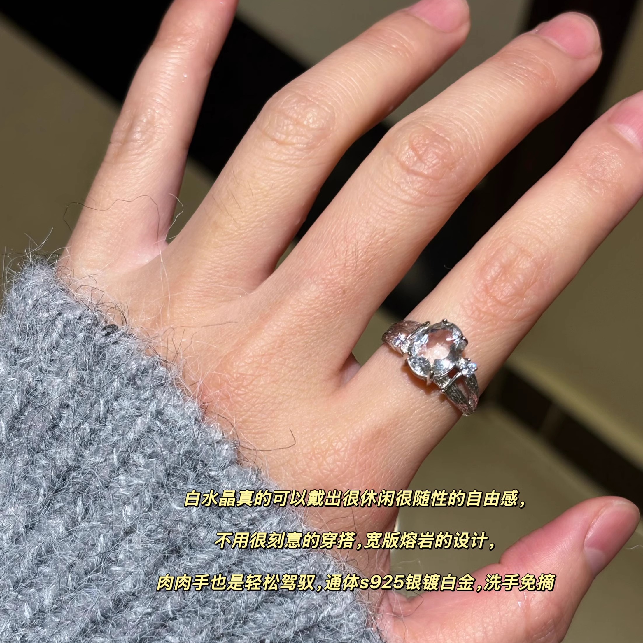 天然白水晶熔岩戒指宽版加厚s925银简约气质轻奢百搭开口食指环女
