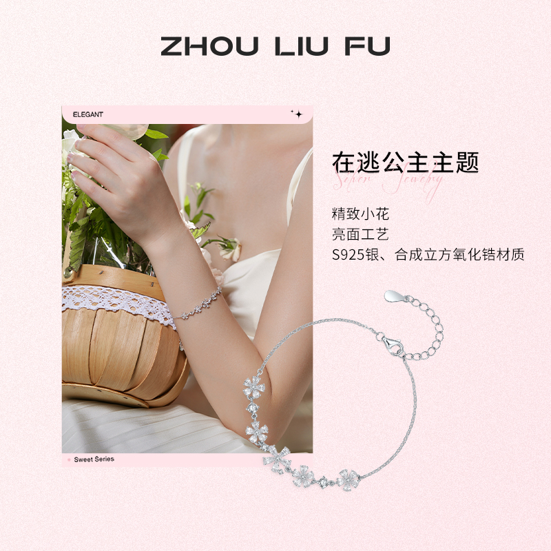 周六福繁花银手链女S925银时尚百搭轻奢小众手饰送女友生日礼物