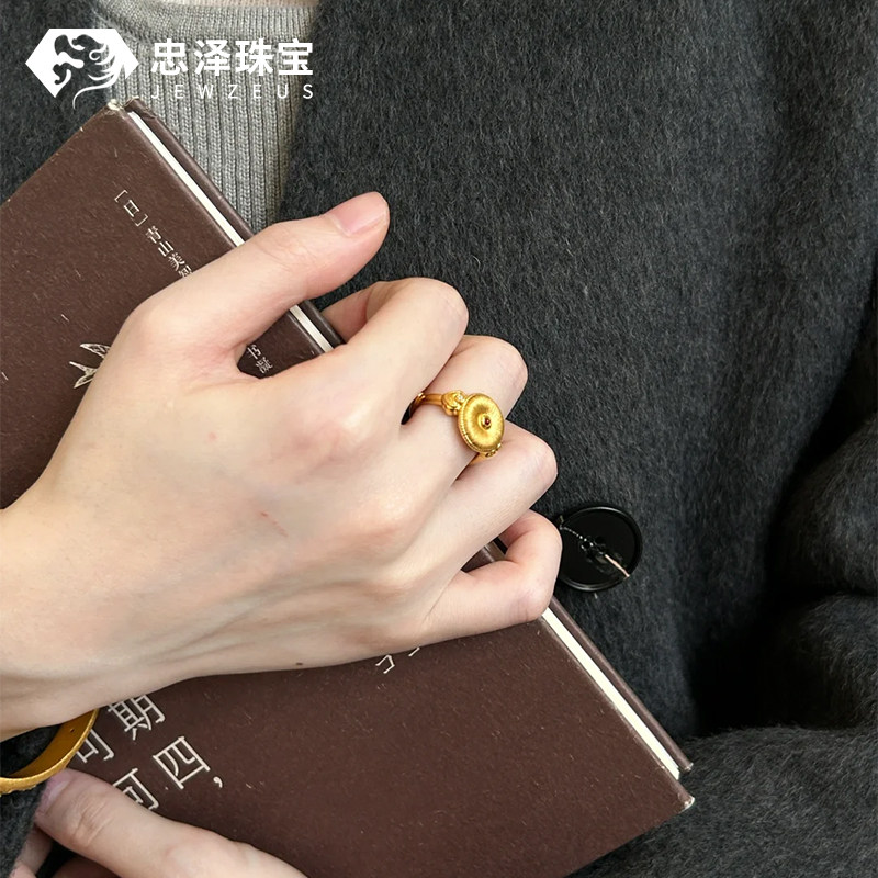 黄金拉丝如意平安扣戒指 5D足金999点钻镶嵌花丝素圈女戒指环送礼