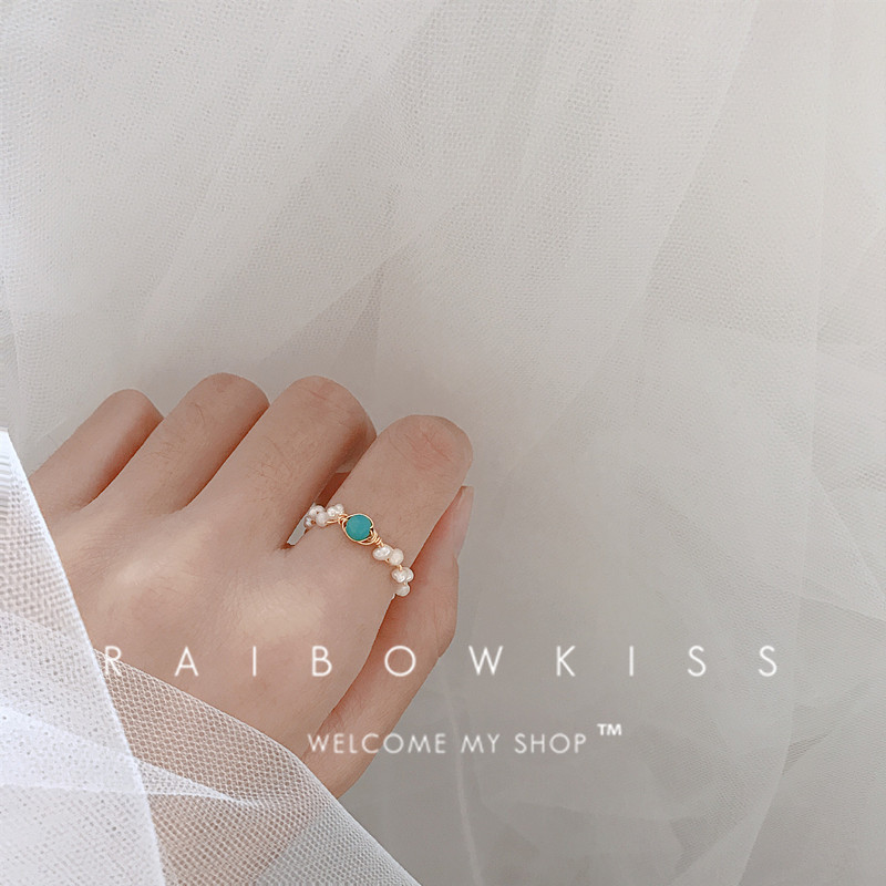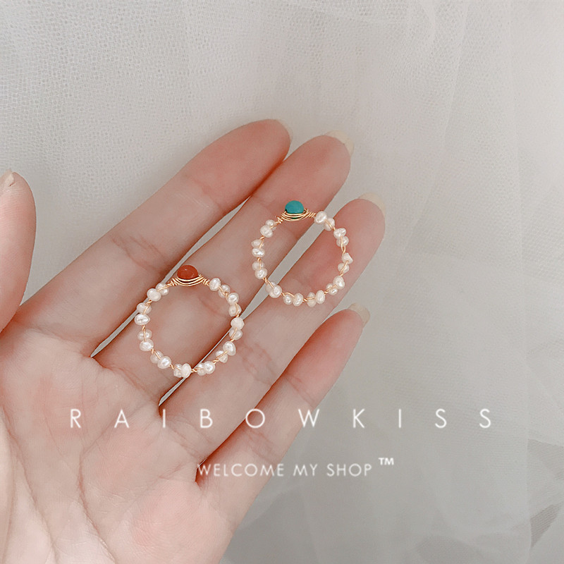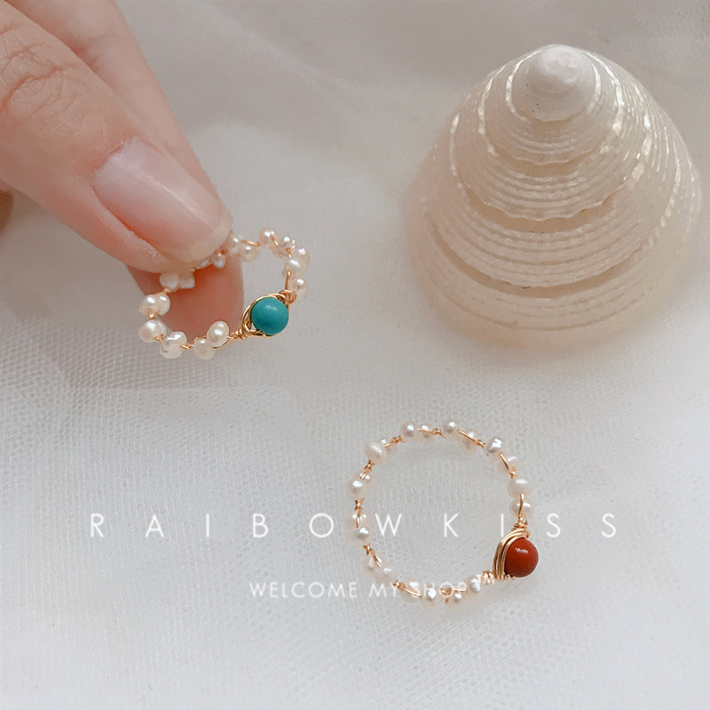 超仙小清新手作14k包金绕线天然巴洛克珍珠松石戒指红宝石尾戒女