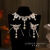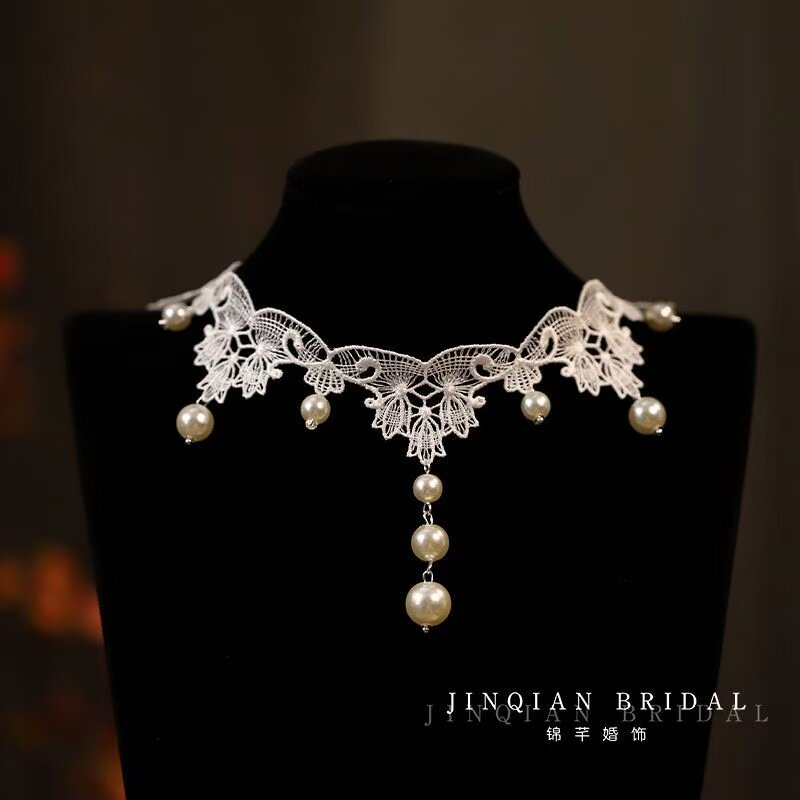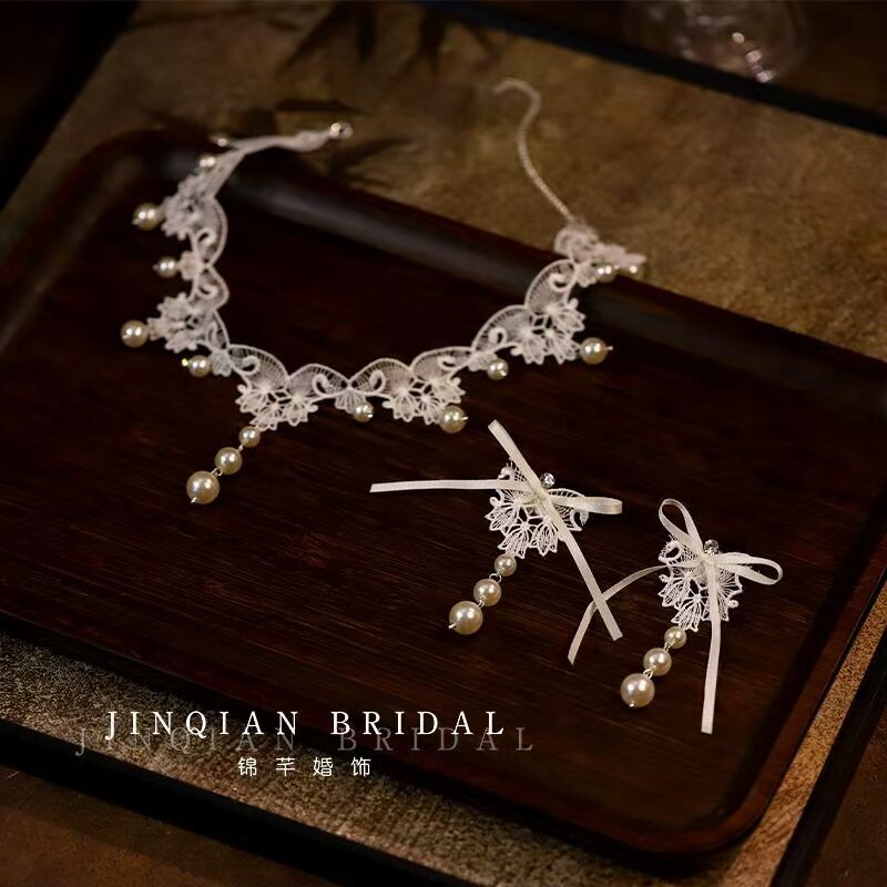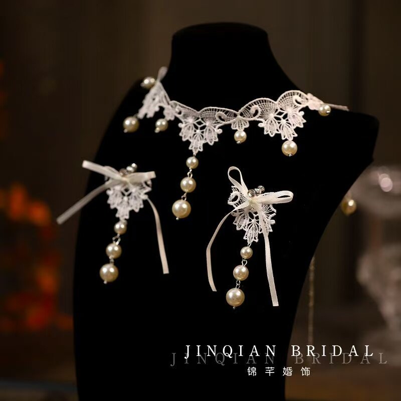 法式新款白色流苏蕾丝复古项链耳环套装新娘结婚纱礼服配饰锁骨链