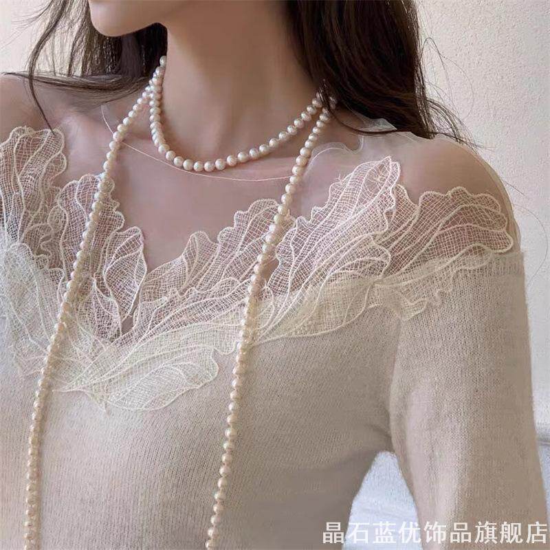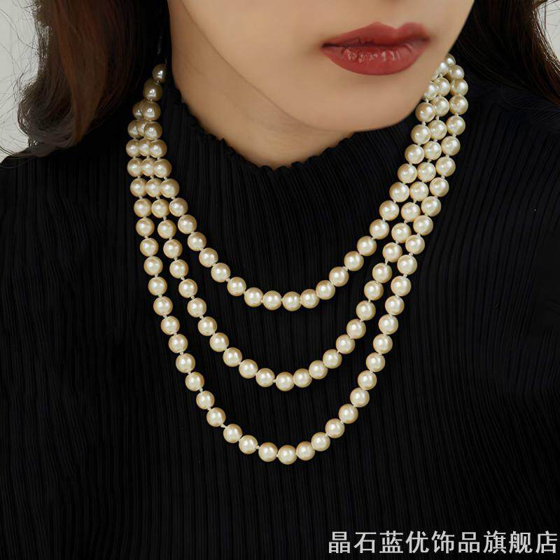 搭配旗袍仿珍珠项链锁骨链子双层叠戴女毛衣链配饰品中长款颈链