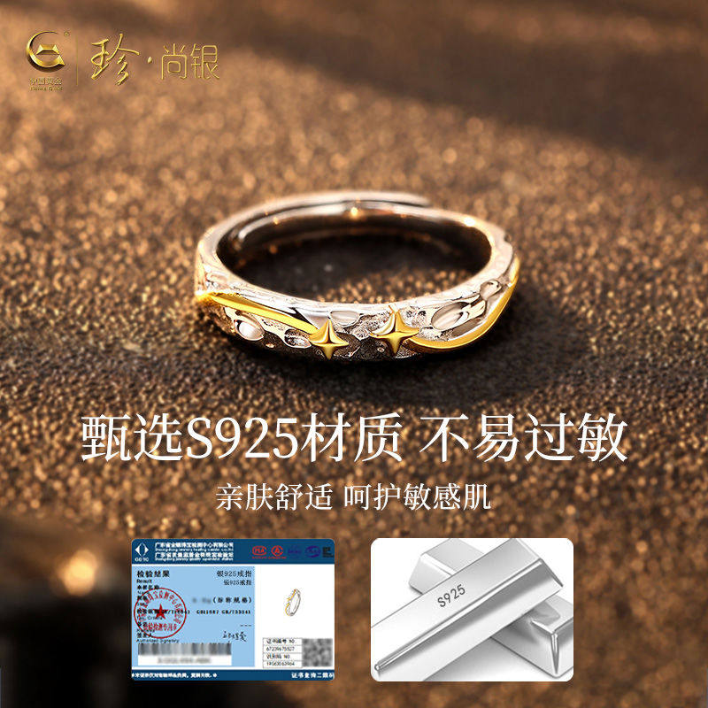 中国黄金珍尚银纯银孤星戒指男自律食指尾戒七夕礼物素圈男戒S925