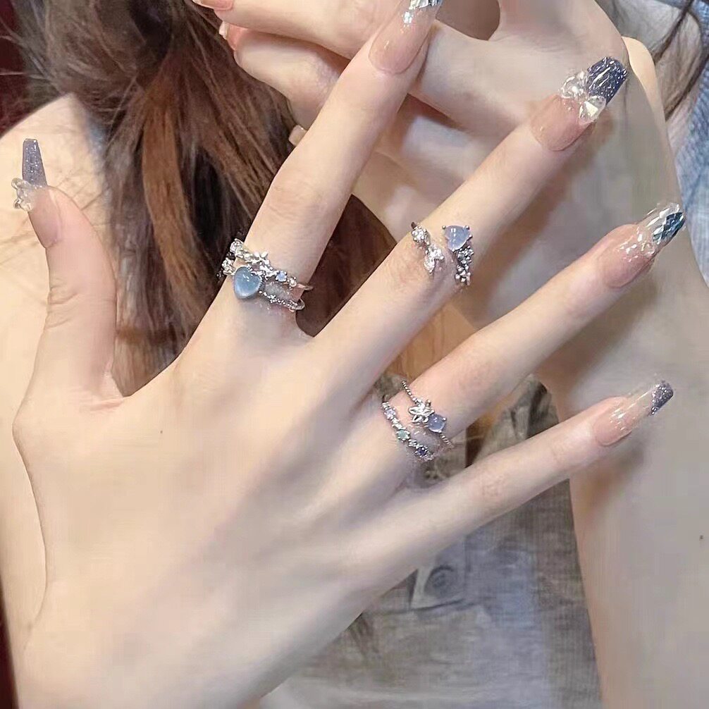 新款蓝色月光猫眼爱心花朵石戒指轻奢小众设计感食指开口戒高级