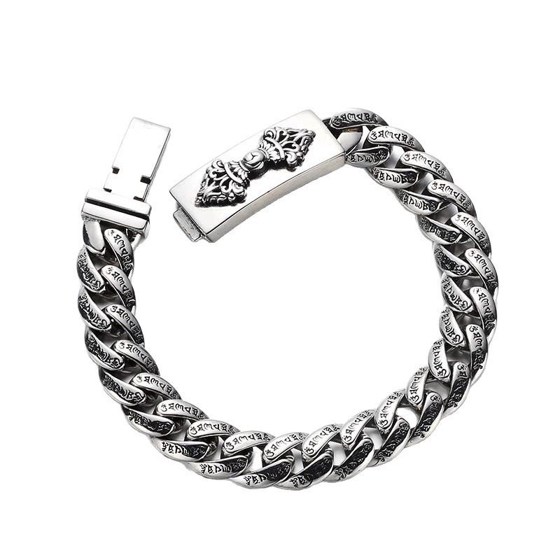 S925银新款民族风金刚杵手链复古做旧六字真言坦克链古风个性银链