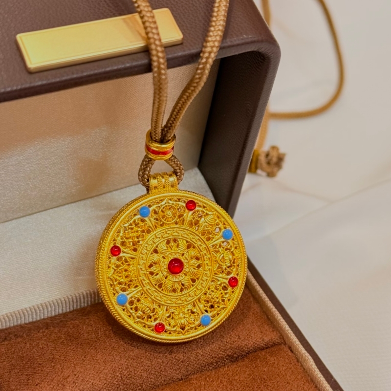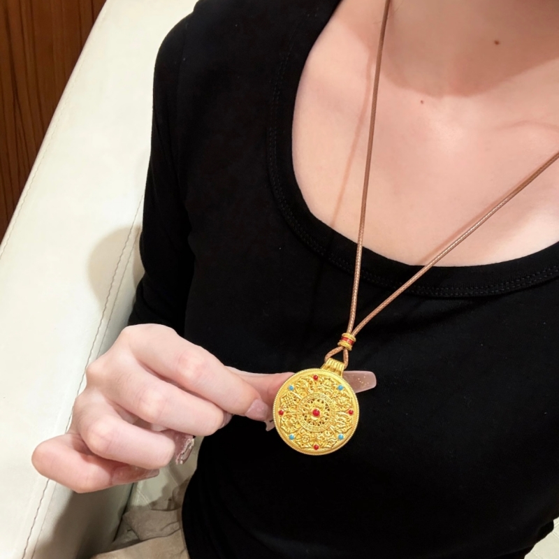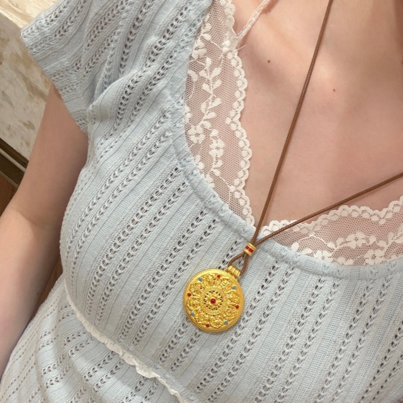 金包银吊坠珐琅圆盘挂坠黄金项链女金色轻奢小众领针毛衣链送女友