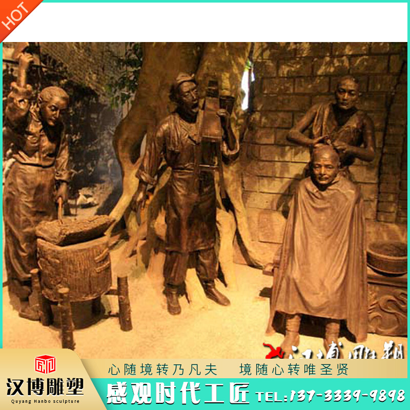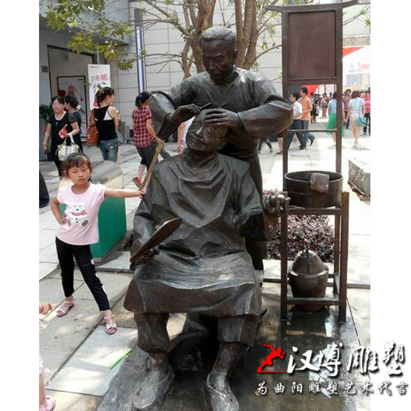传统手艺剃头师傅人物雕塑民俗小品雕塑玻璃钢仿铜雕塑公园景观