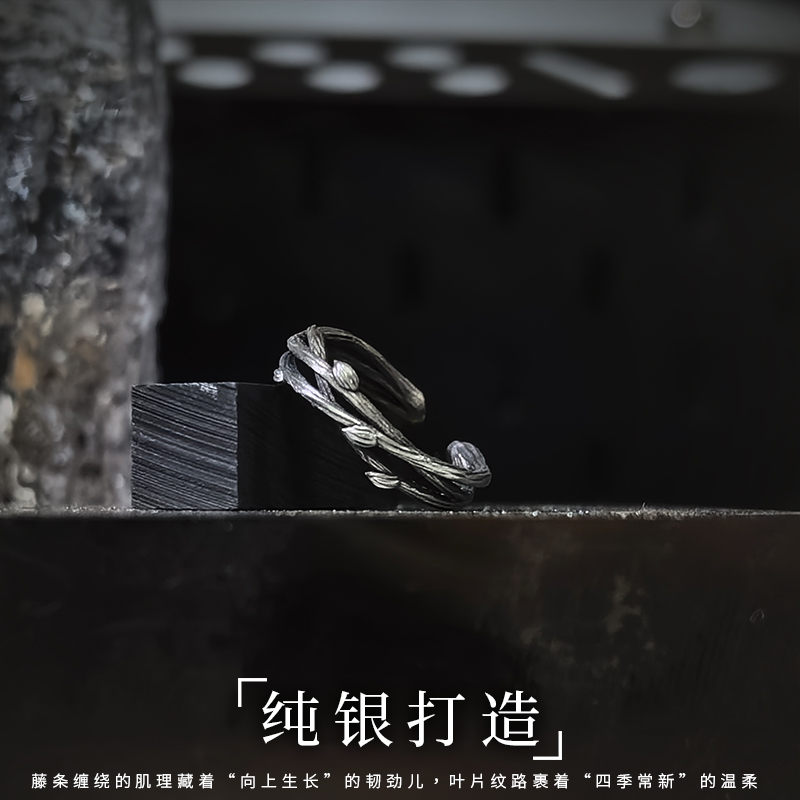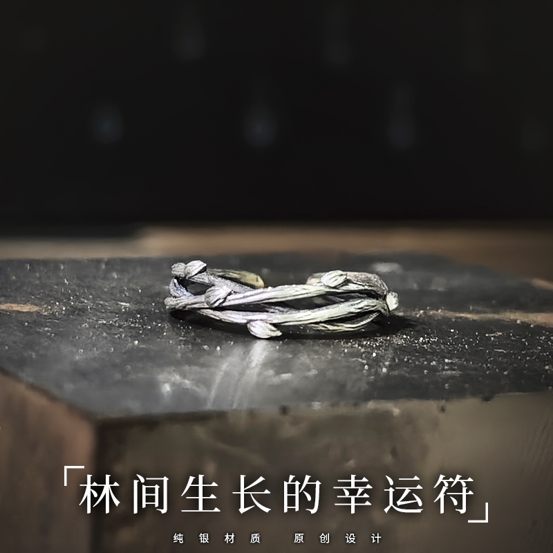 原创藤条树叶复古S925纯银戒指男女小众设计感开口可调节简约