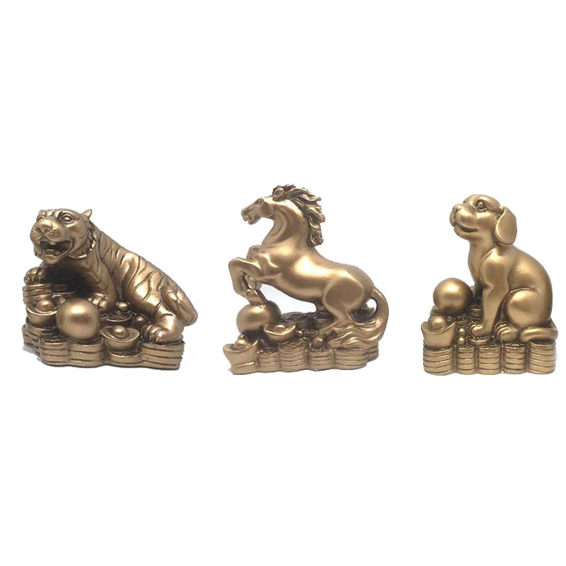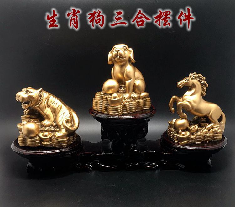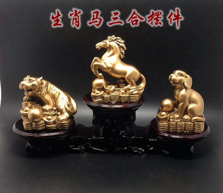 金色树脂虎马狗三合摆件生肖贵人寅午戌客厅办公桌摆设装饰工艺品