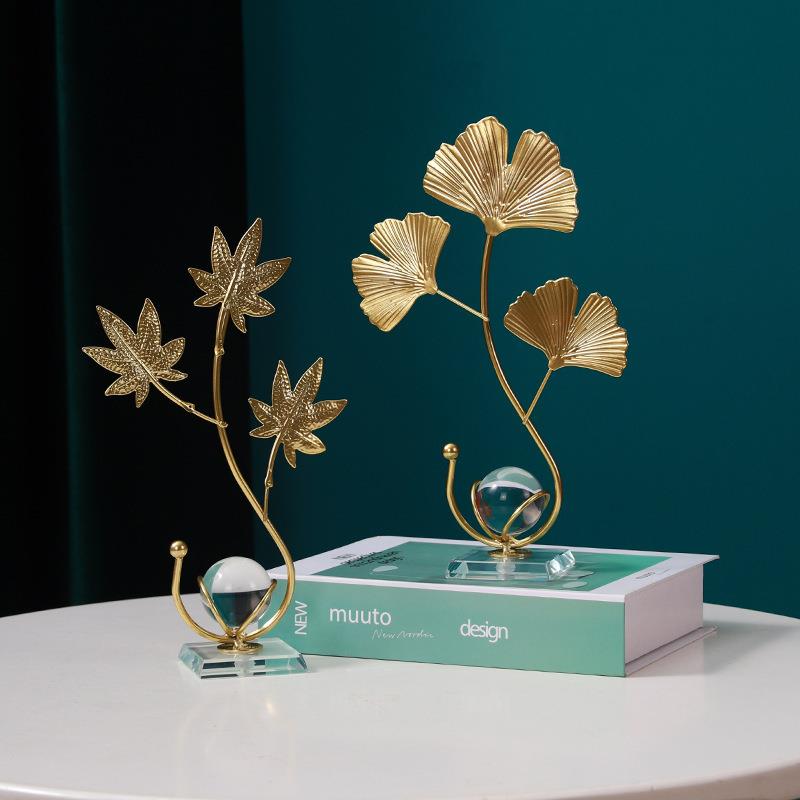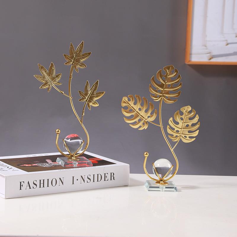 北欧轻奢铁艺树叶银杏叶水晶球摆件家居客厅玄关办公室桌面装饰品