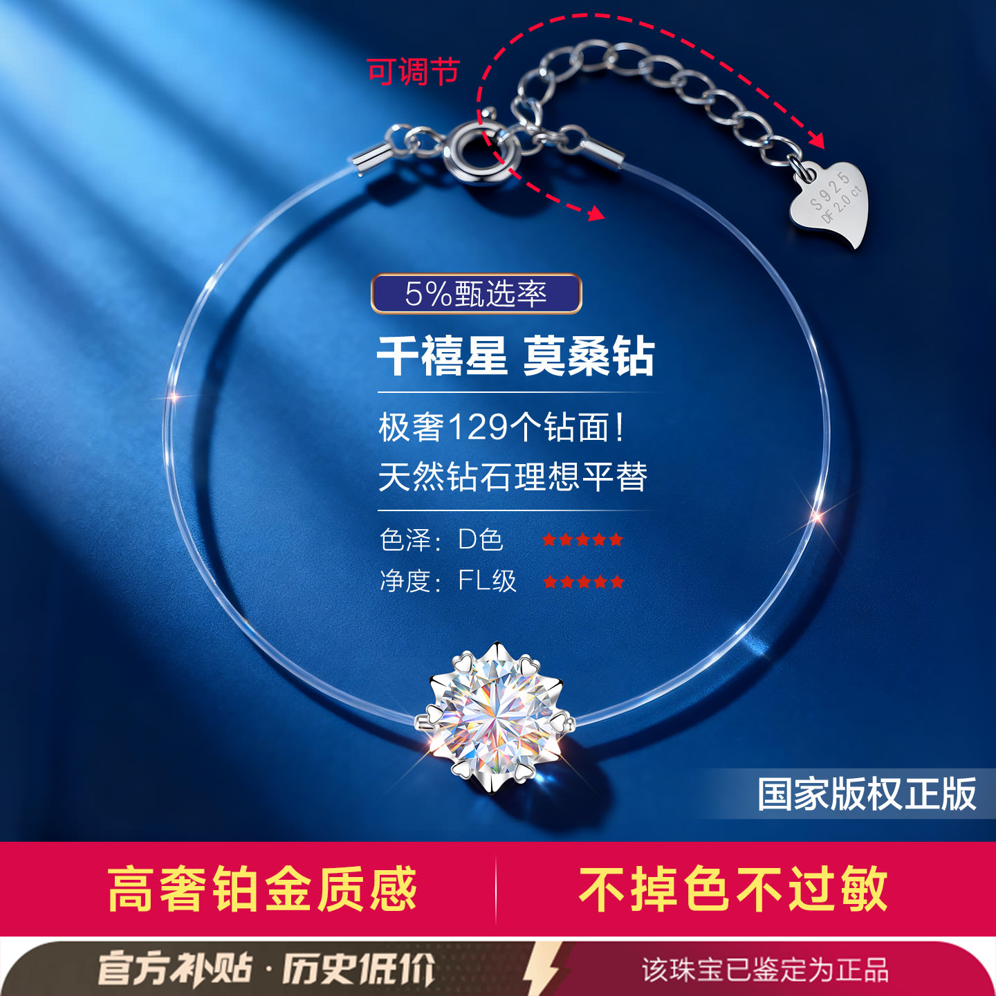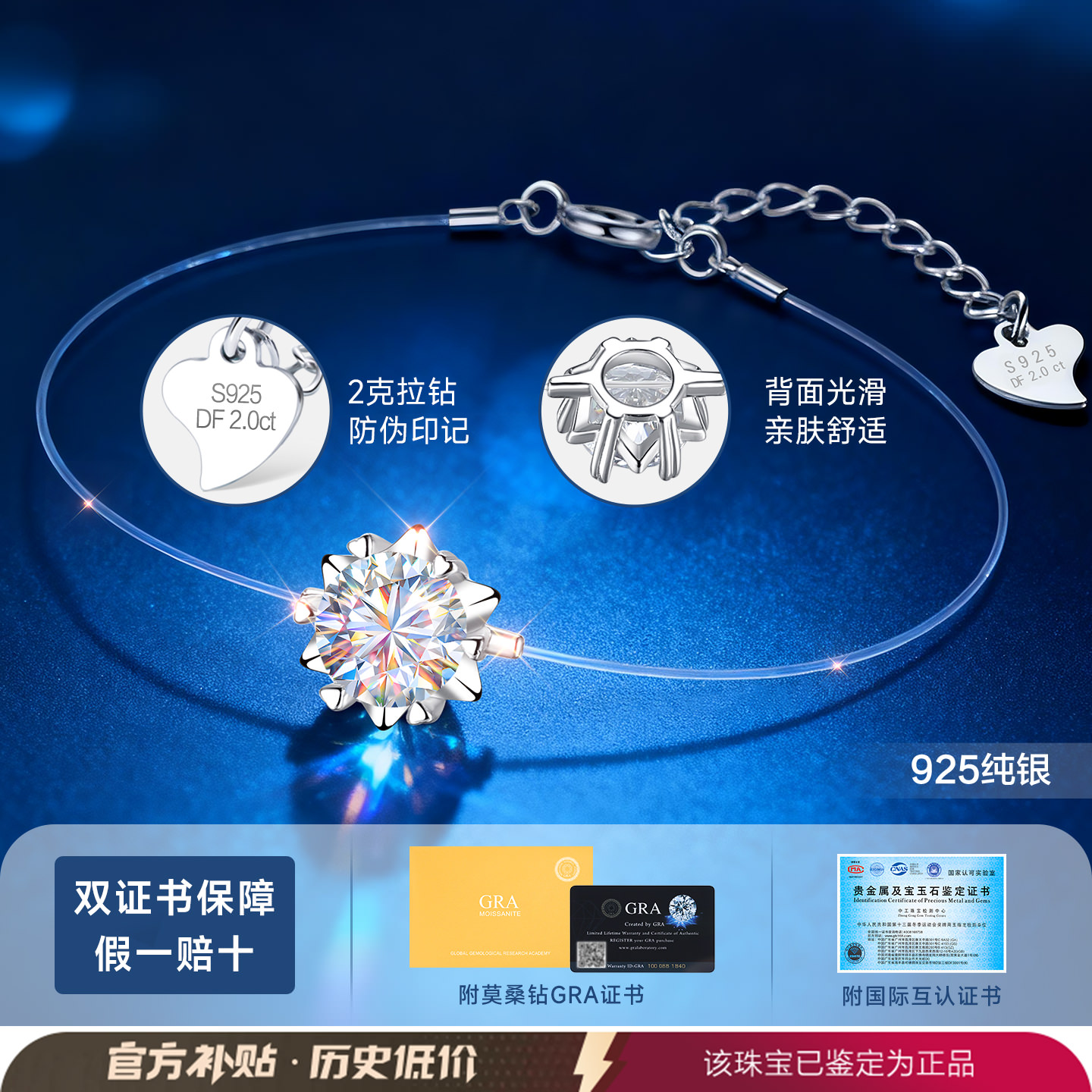 隐形鱼线雪花银手链女款女生女纯银手饰2克拉莫桑钻莫桑石送女友