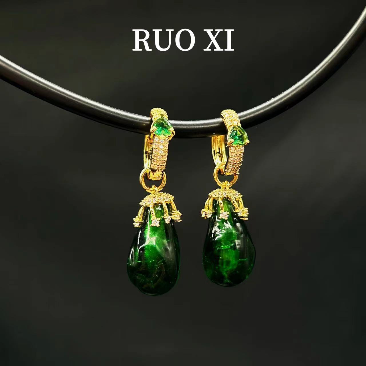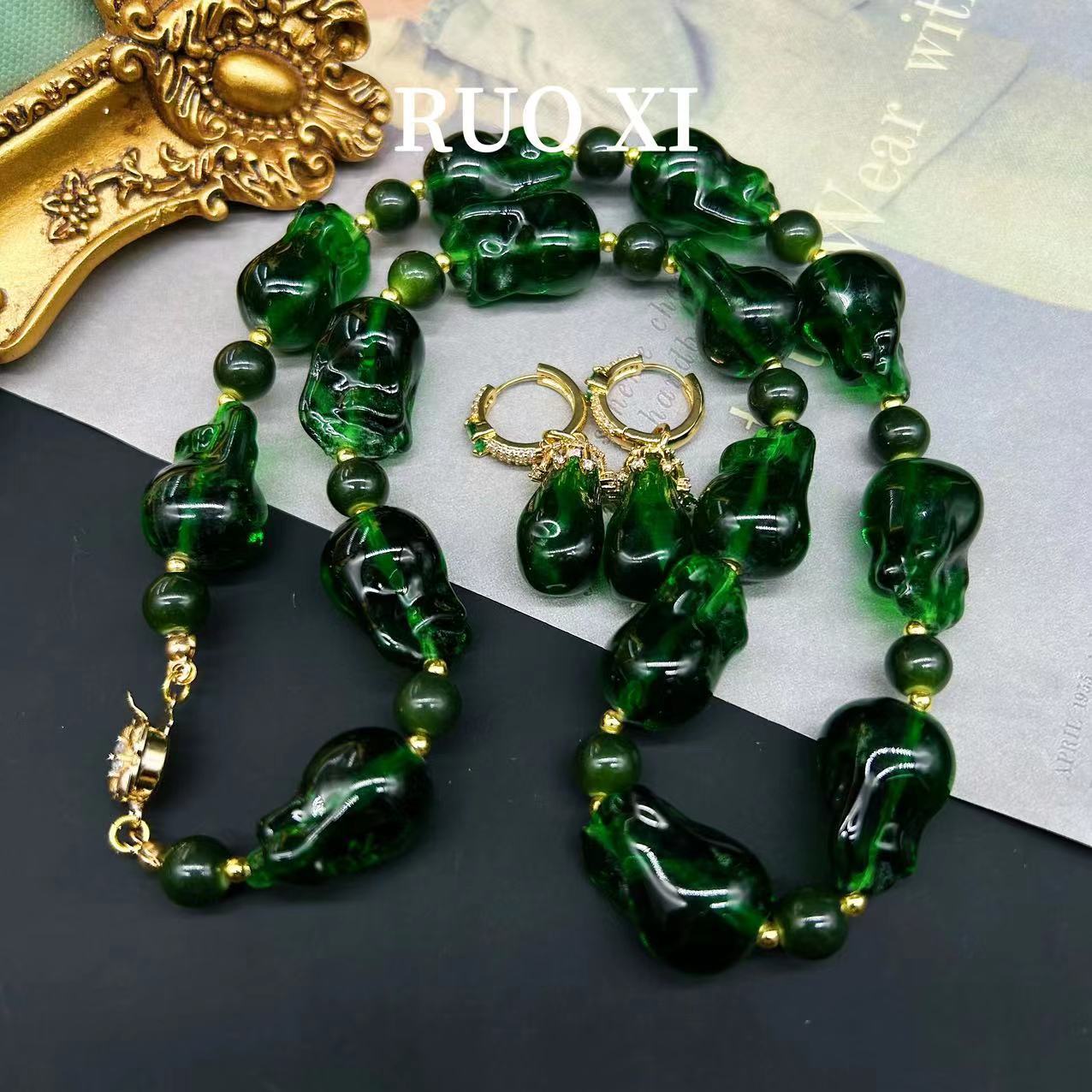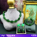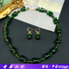 中古vintage西洋回流祖母绿琉璃复古多巴胺绿色项链镶钻轻奢耳环
