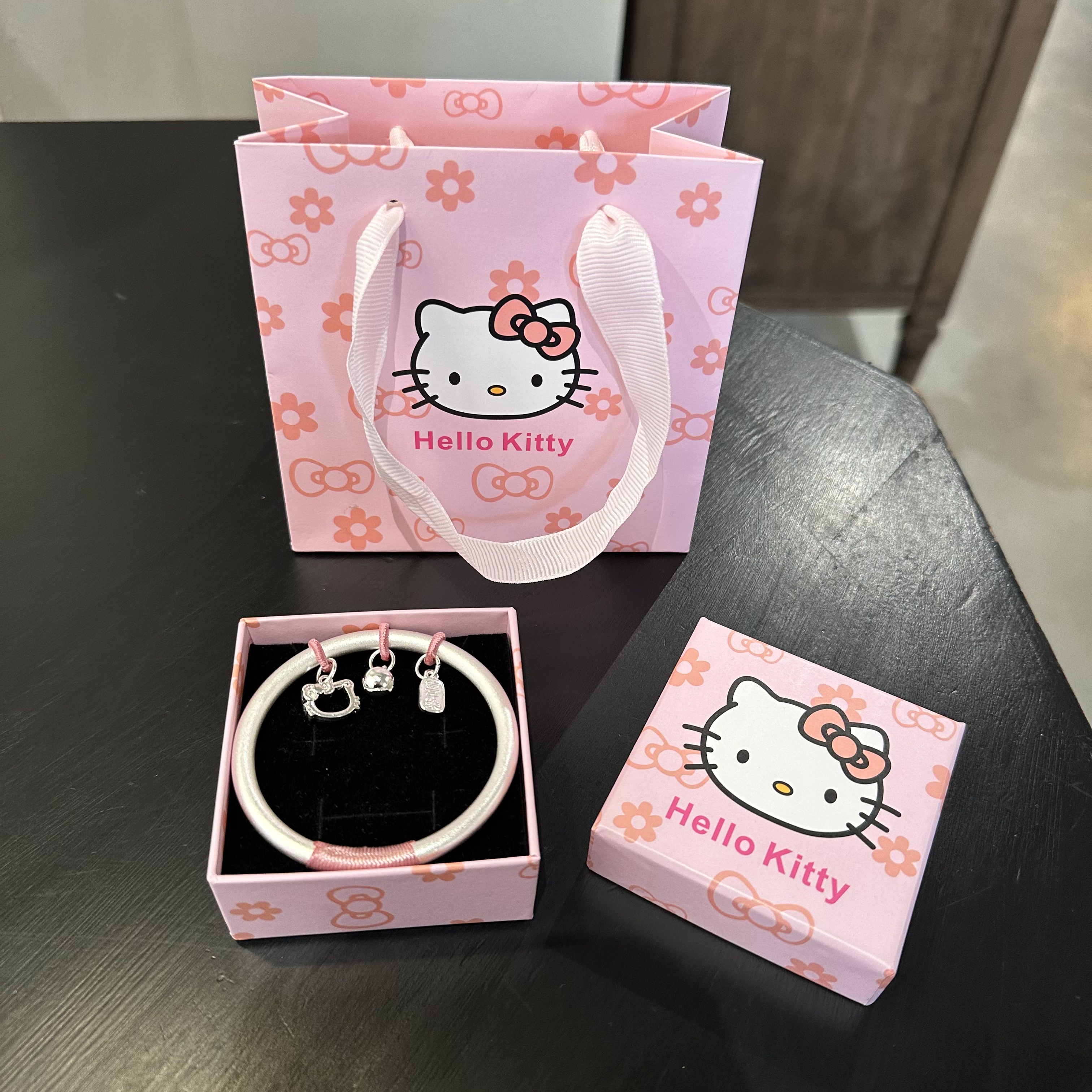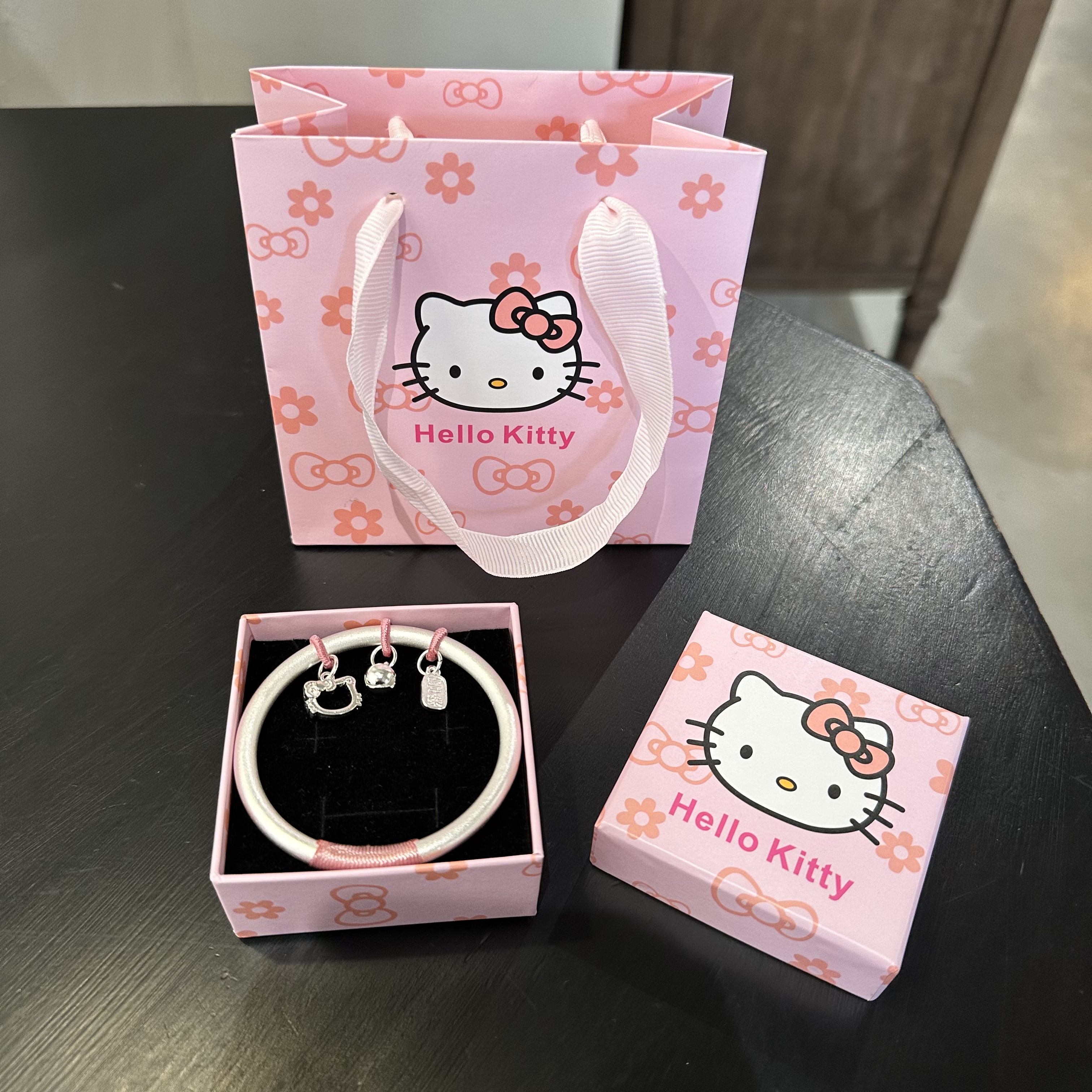 999足银HelloKitty铃铛手镯女平安喜乐实心银镯子生日送女友礼物