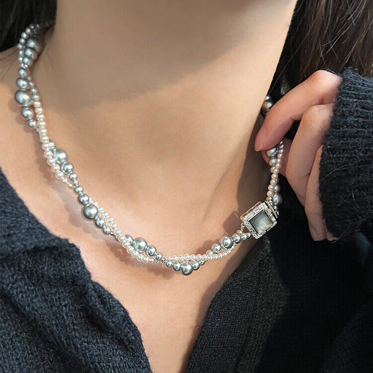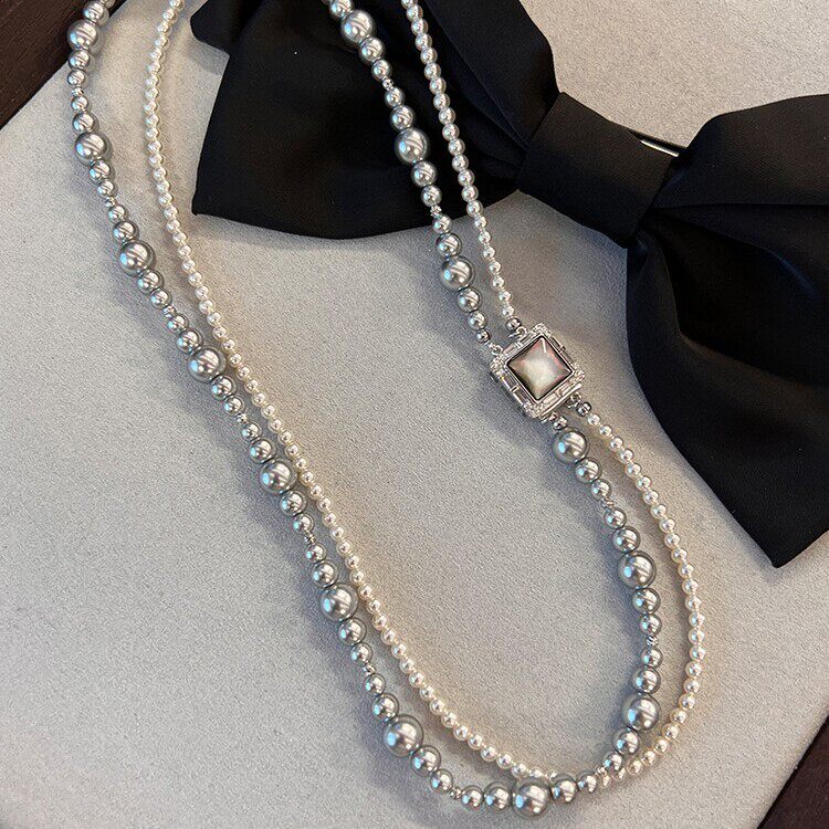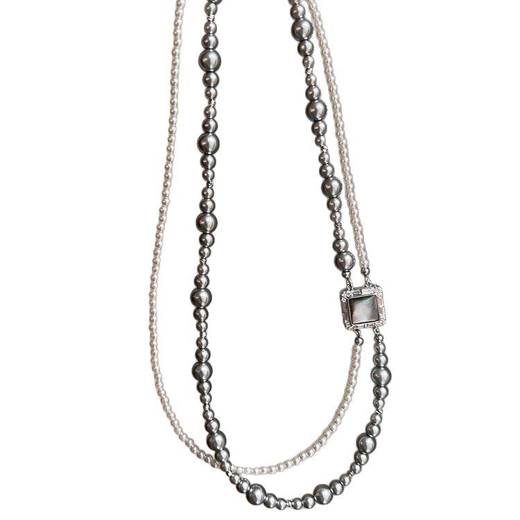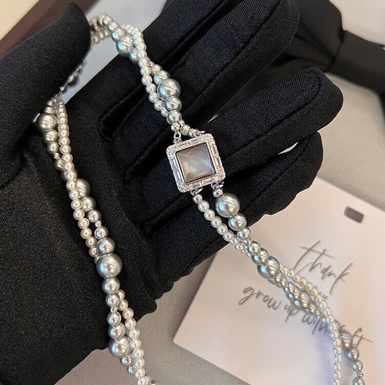 双层施家珍珠项链叠代女轻奢小众设计天然黑贝母扣百搭毛衣链颈链