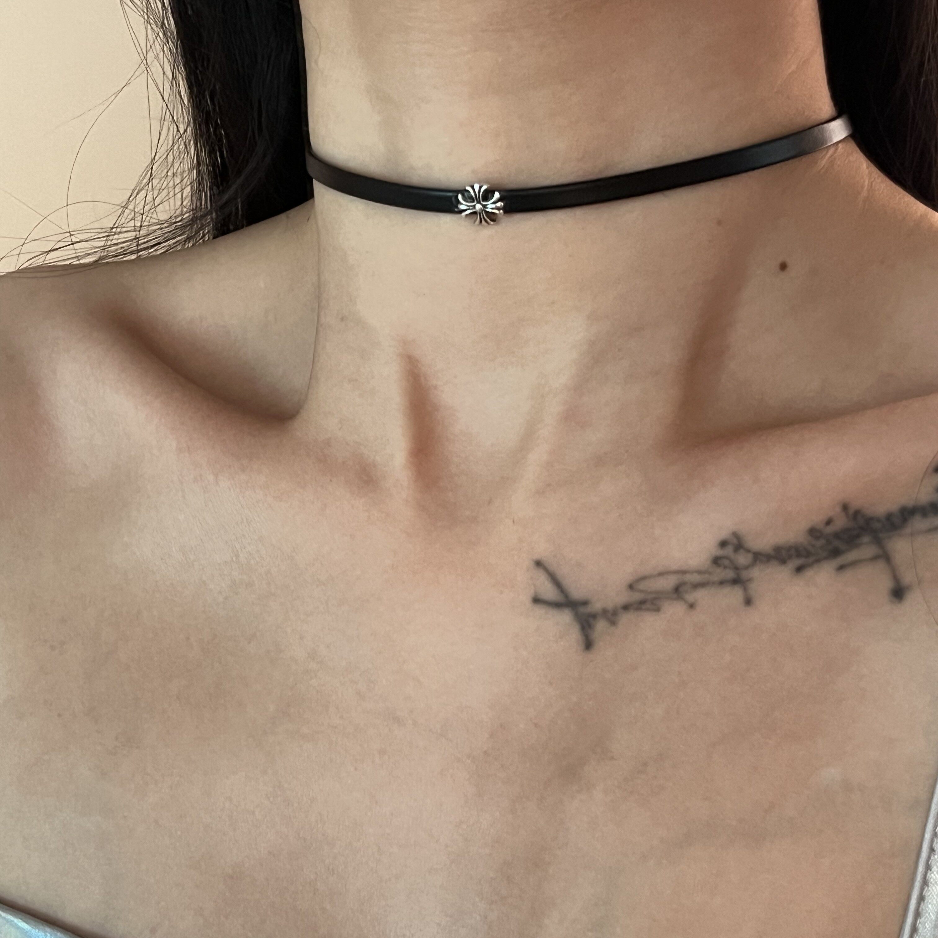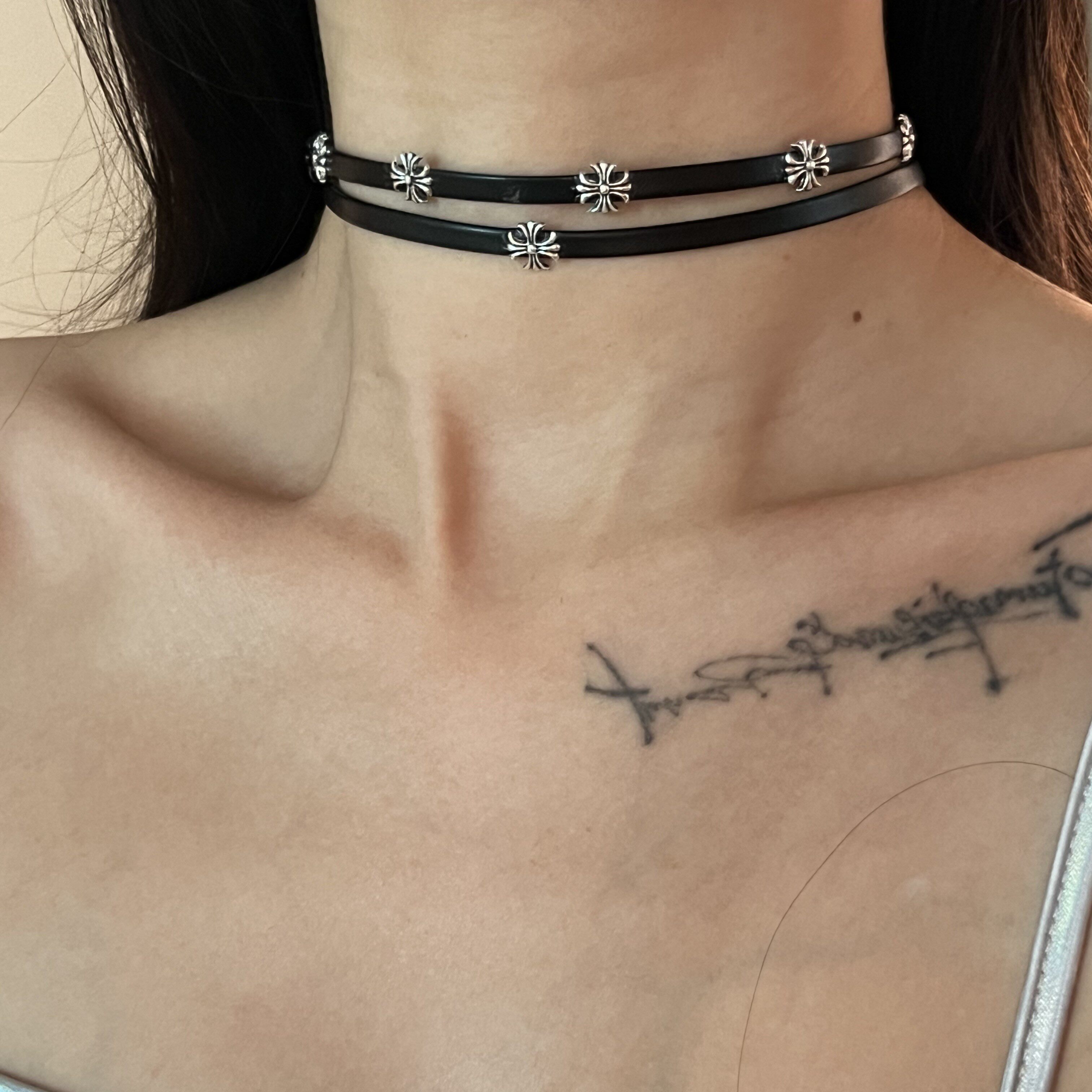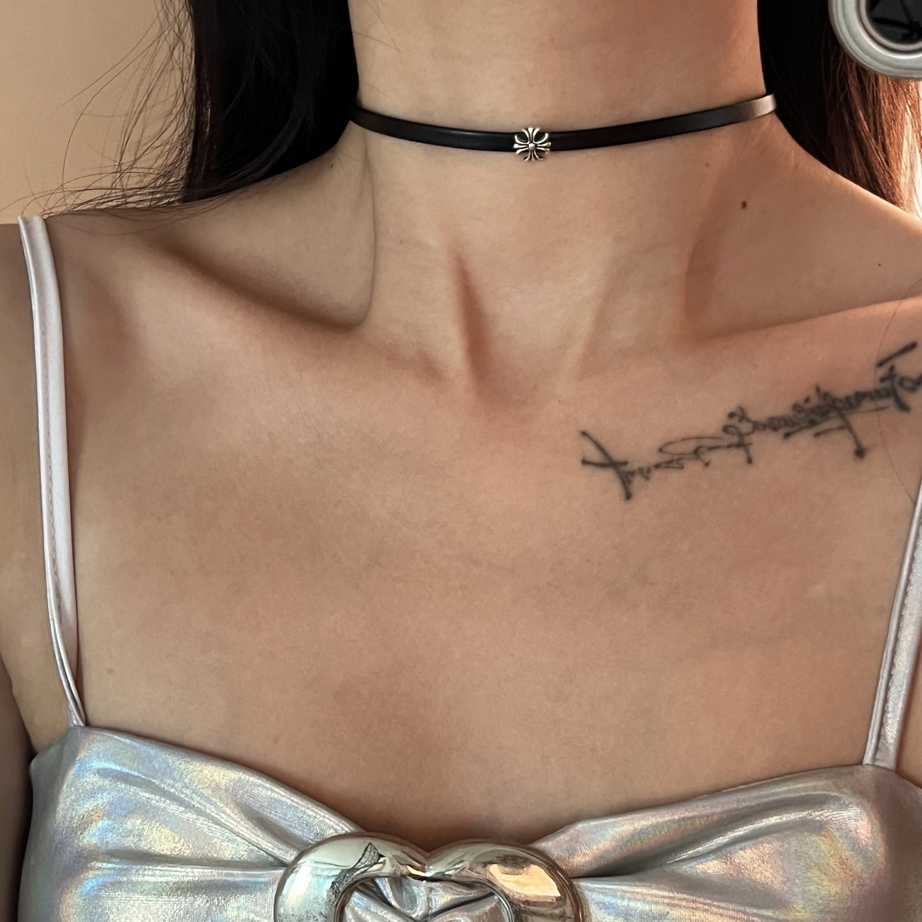 [楼哈哈]小众黑色皮革十字花细款锁骨链choker项圈百搭高级感项链