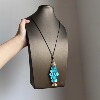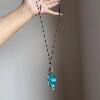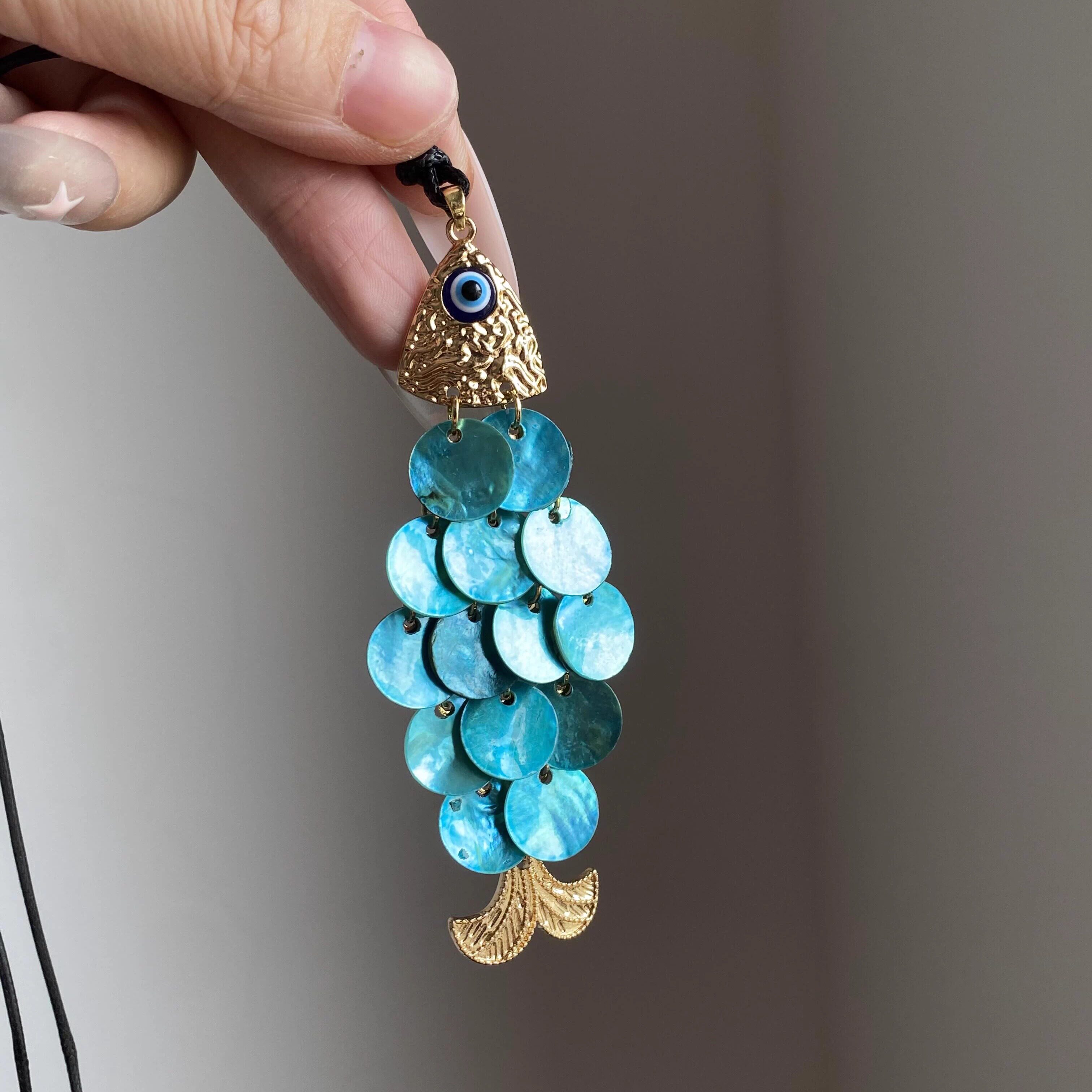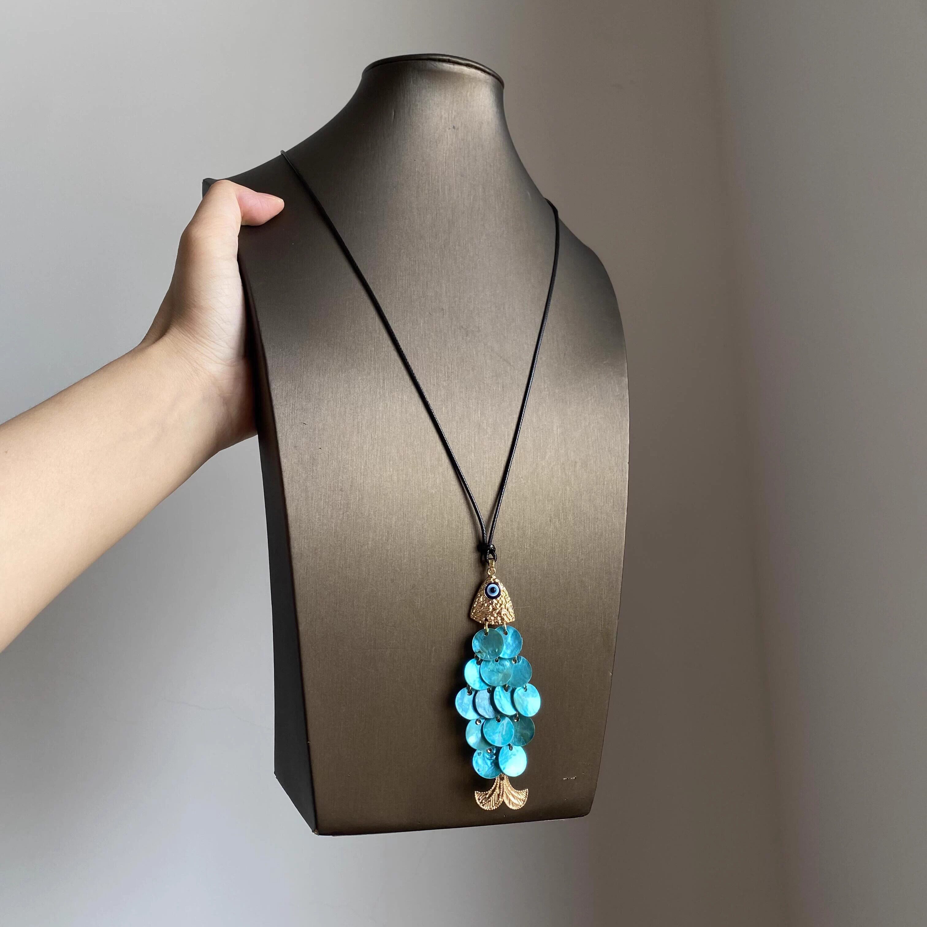 文艺时尚蓝色贝壳鱼鳞片小鱼儿吊坠黑色蜡绳配饰项链高级感毛衣链