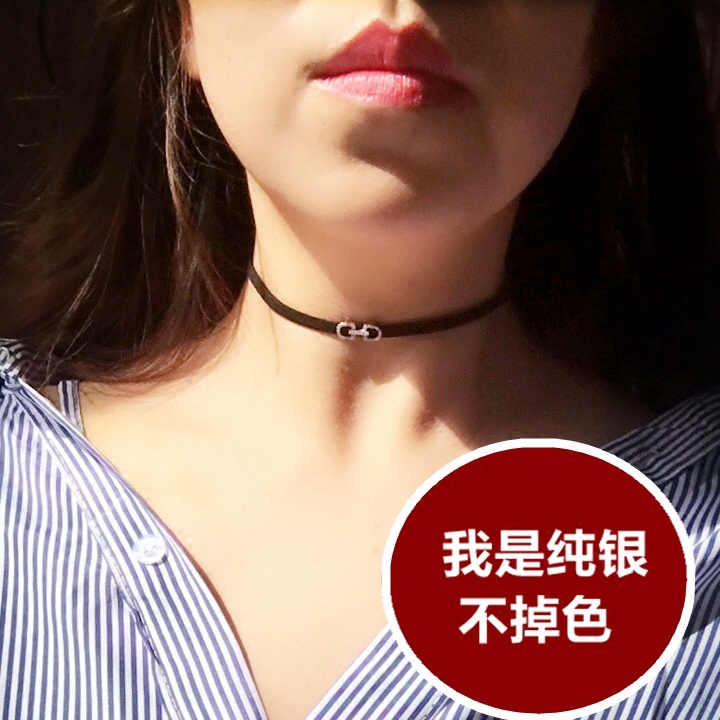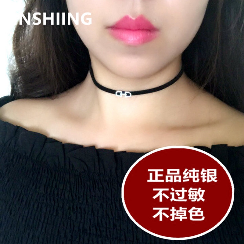925纯银黑色项链女锁骨链短款颈带项圈choker脖链CD字母颈链小众
