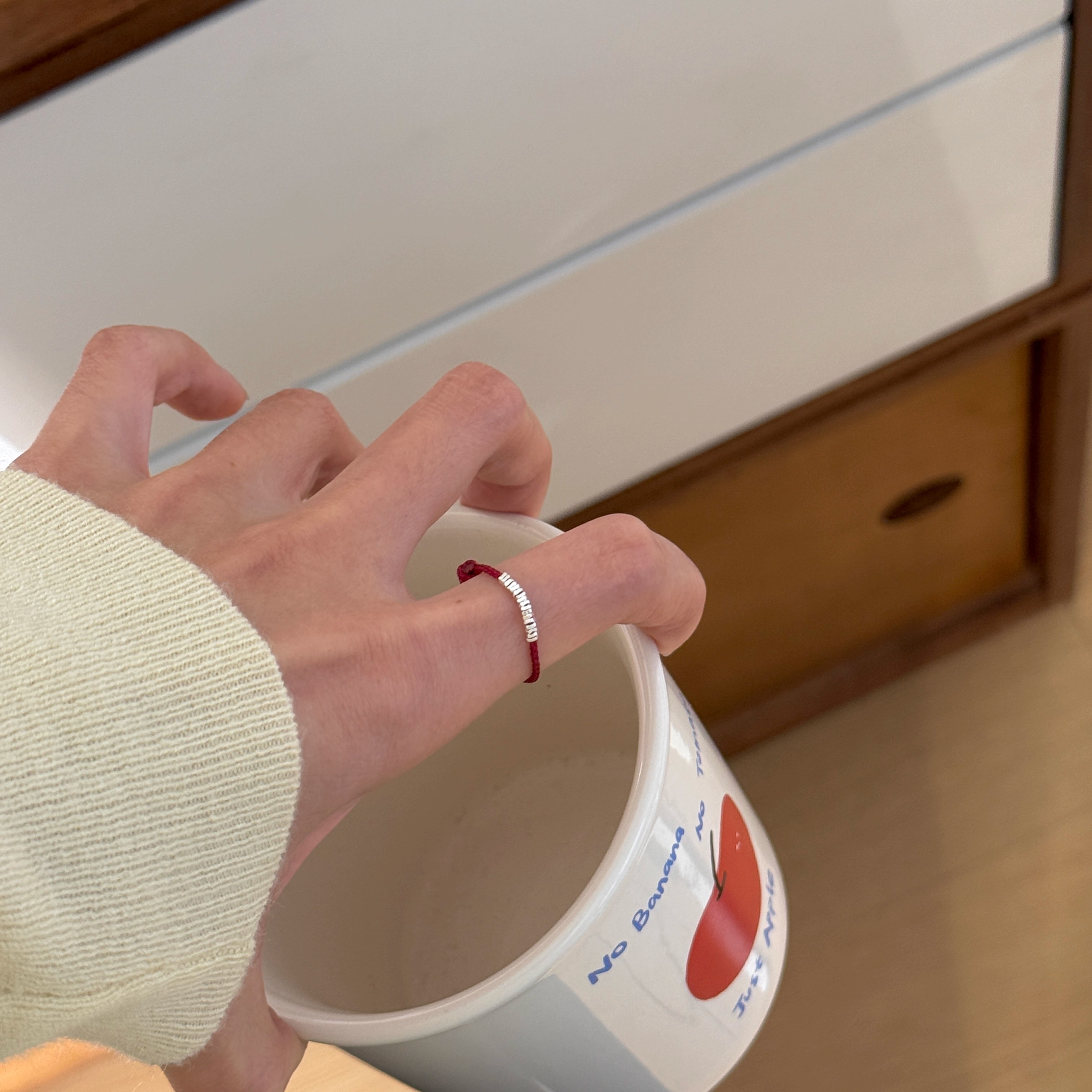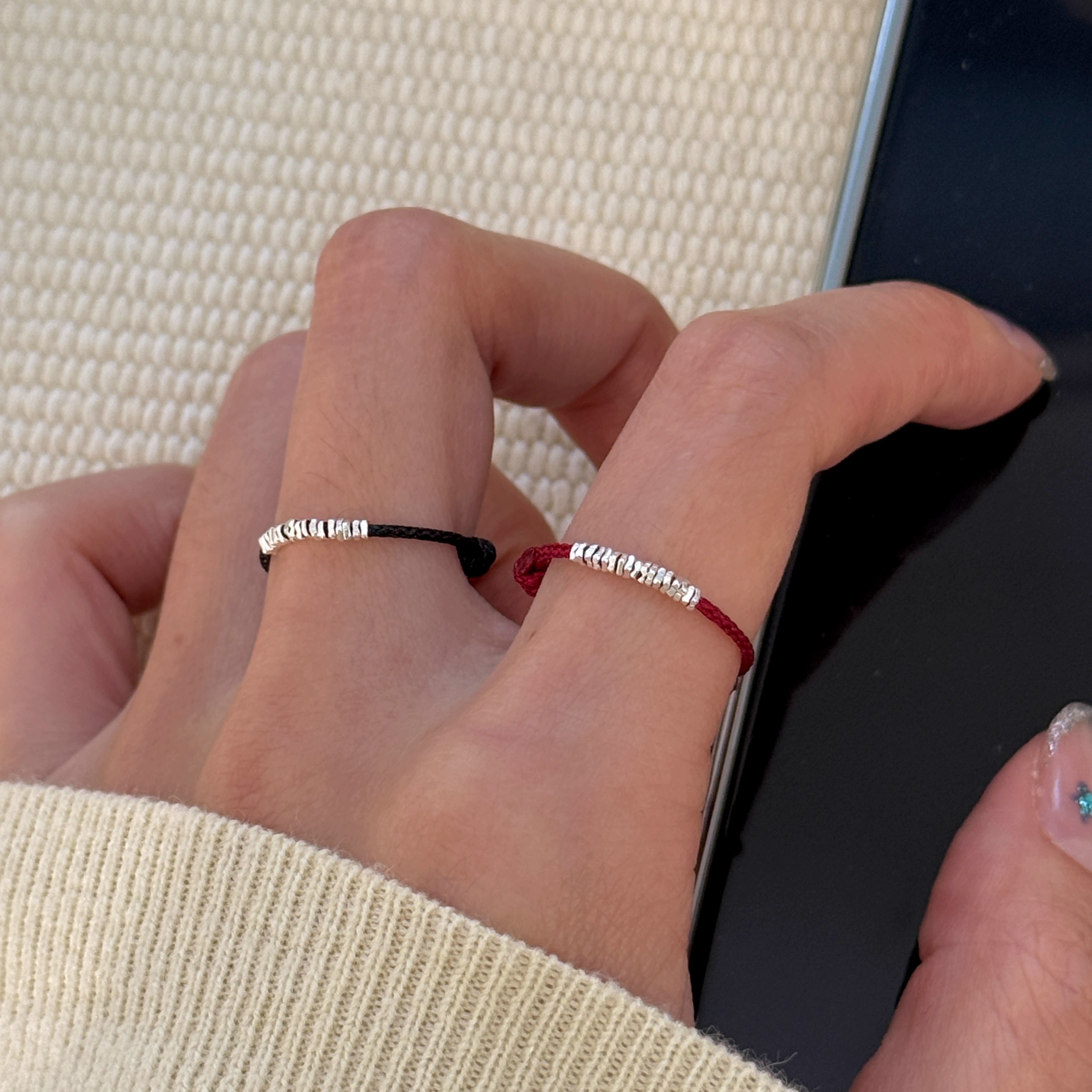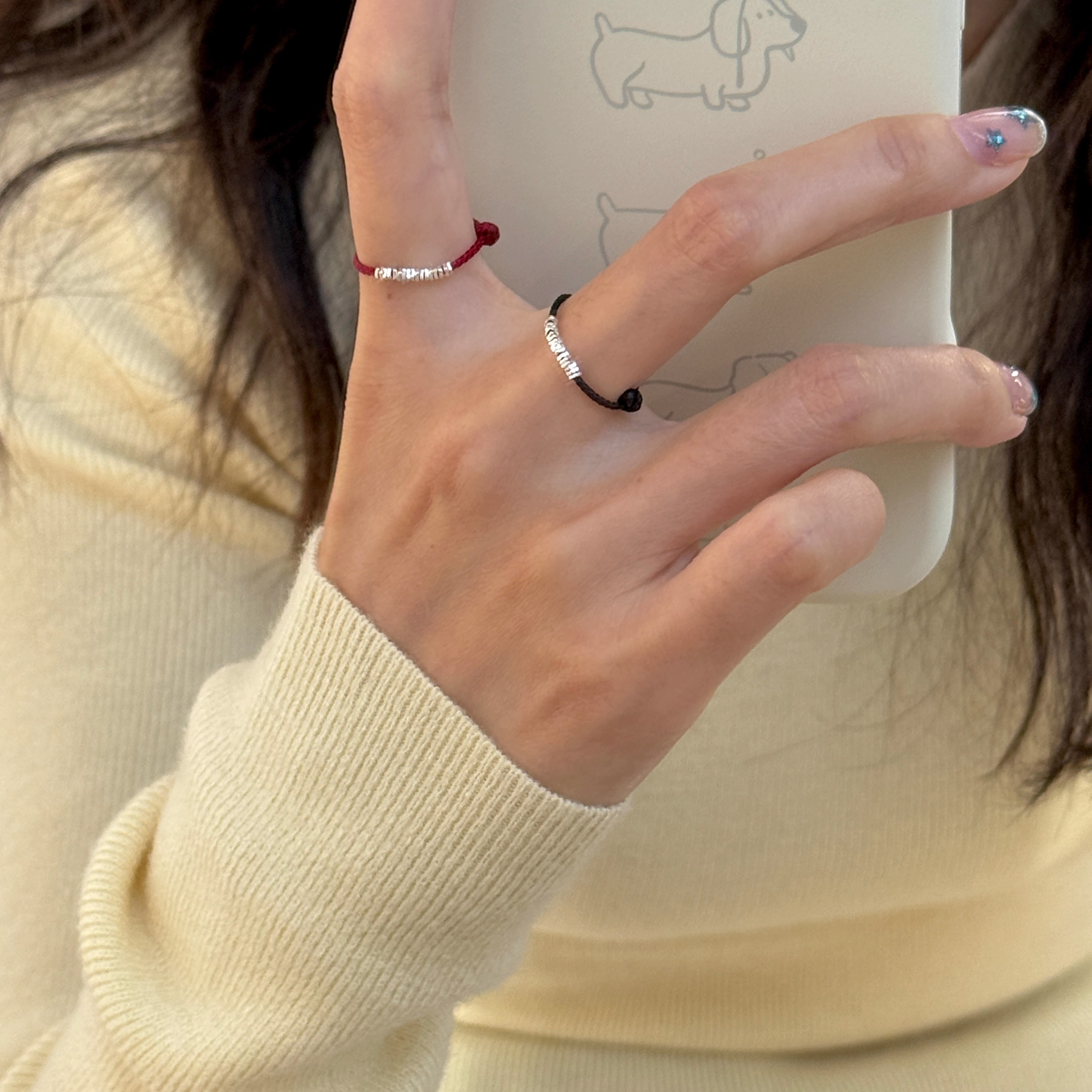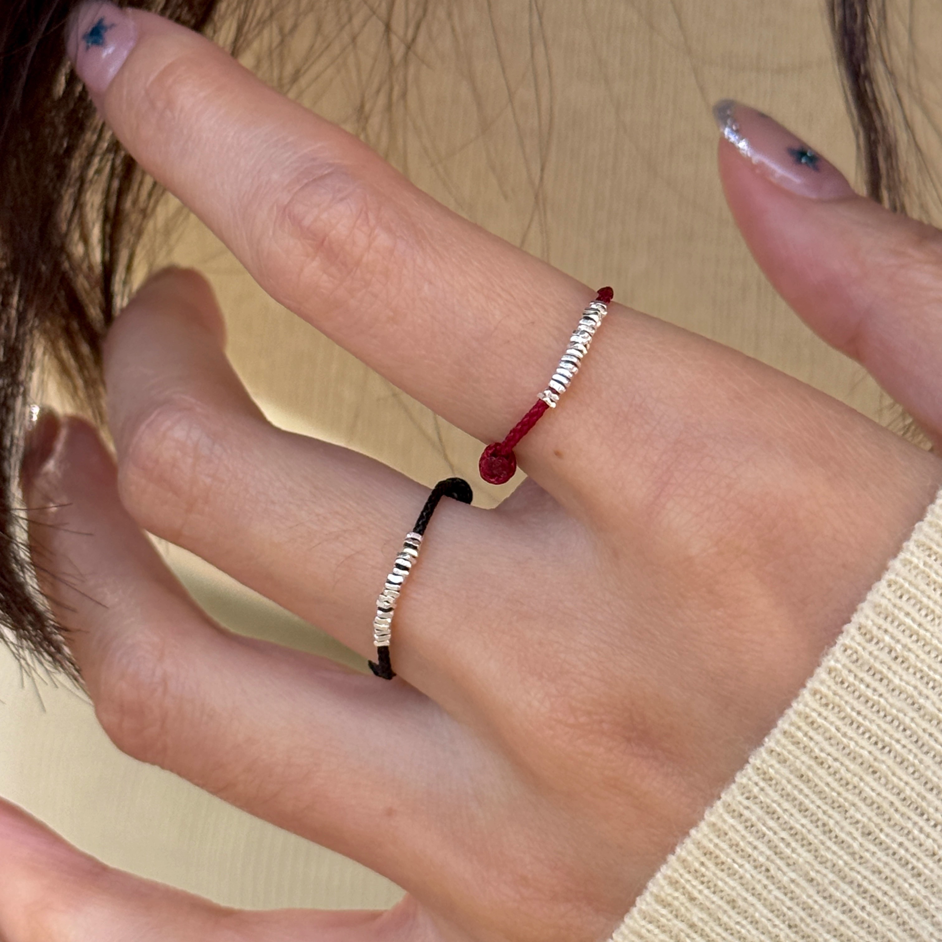 s925纯银黑绳碎银子红绳戒指女可爱精致新年礼物过年氛围情侣对戒