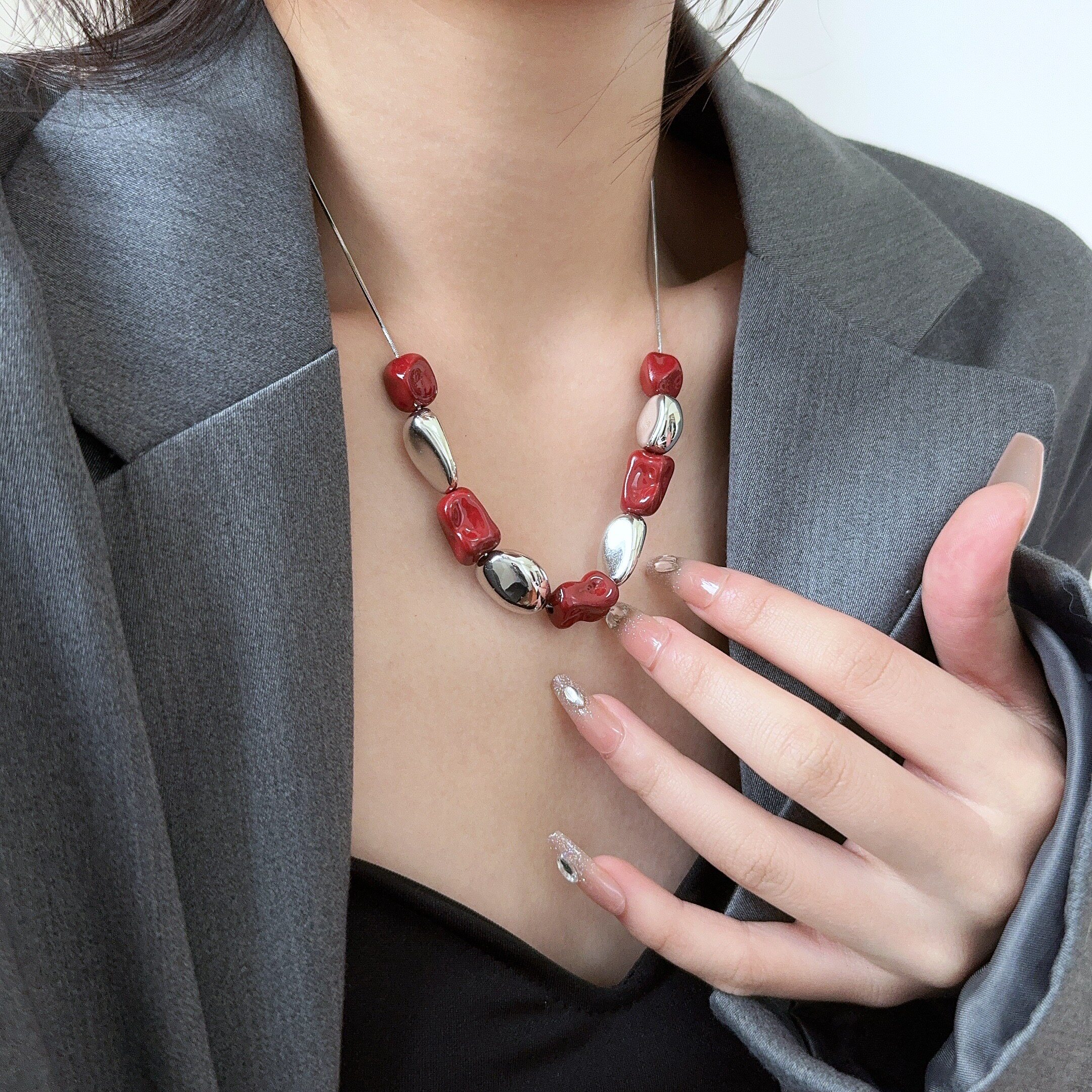 异形不规则红色夸张时尚个性项链女配饰简约小众串珠蛇骨链颈链潮