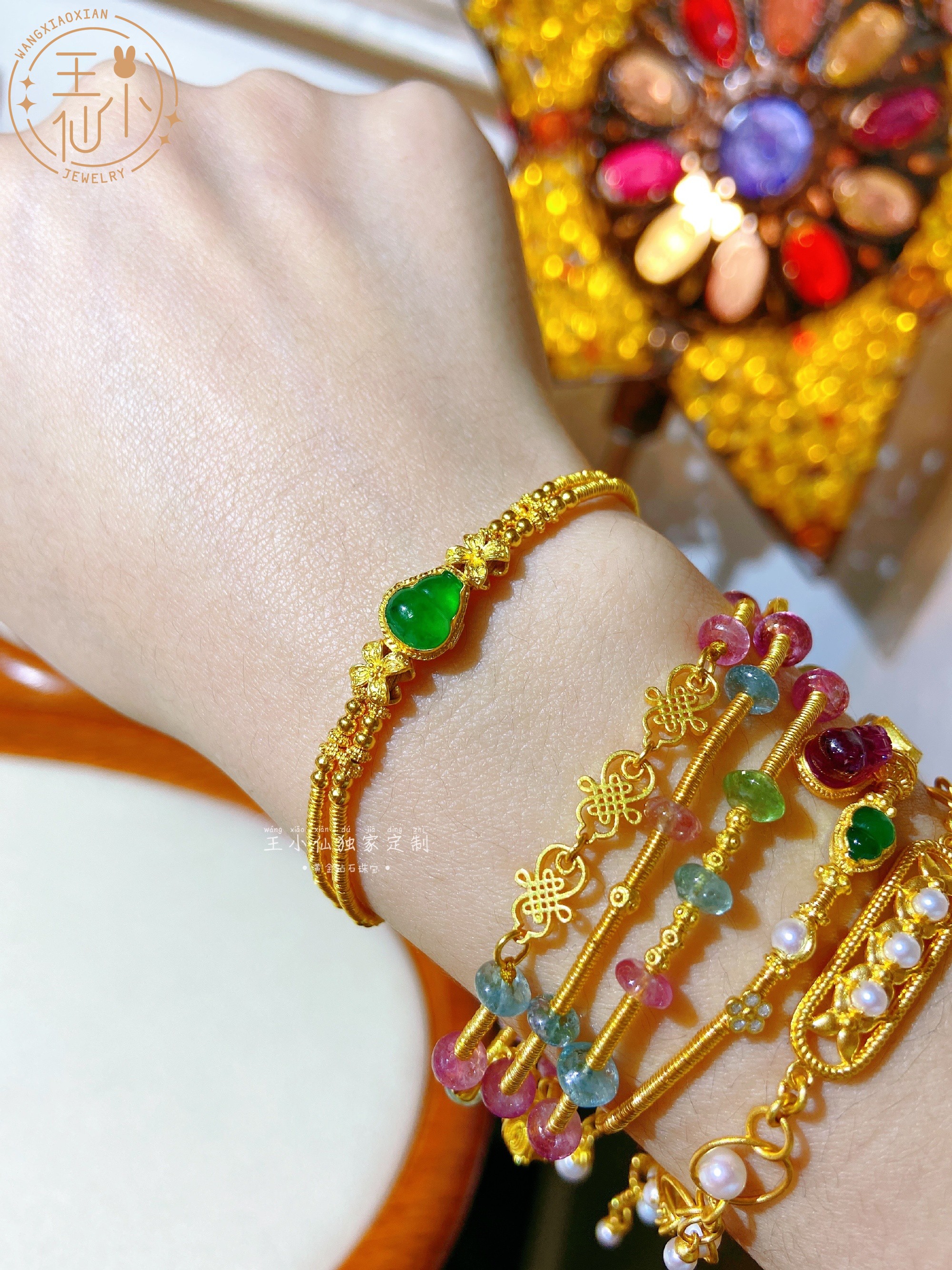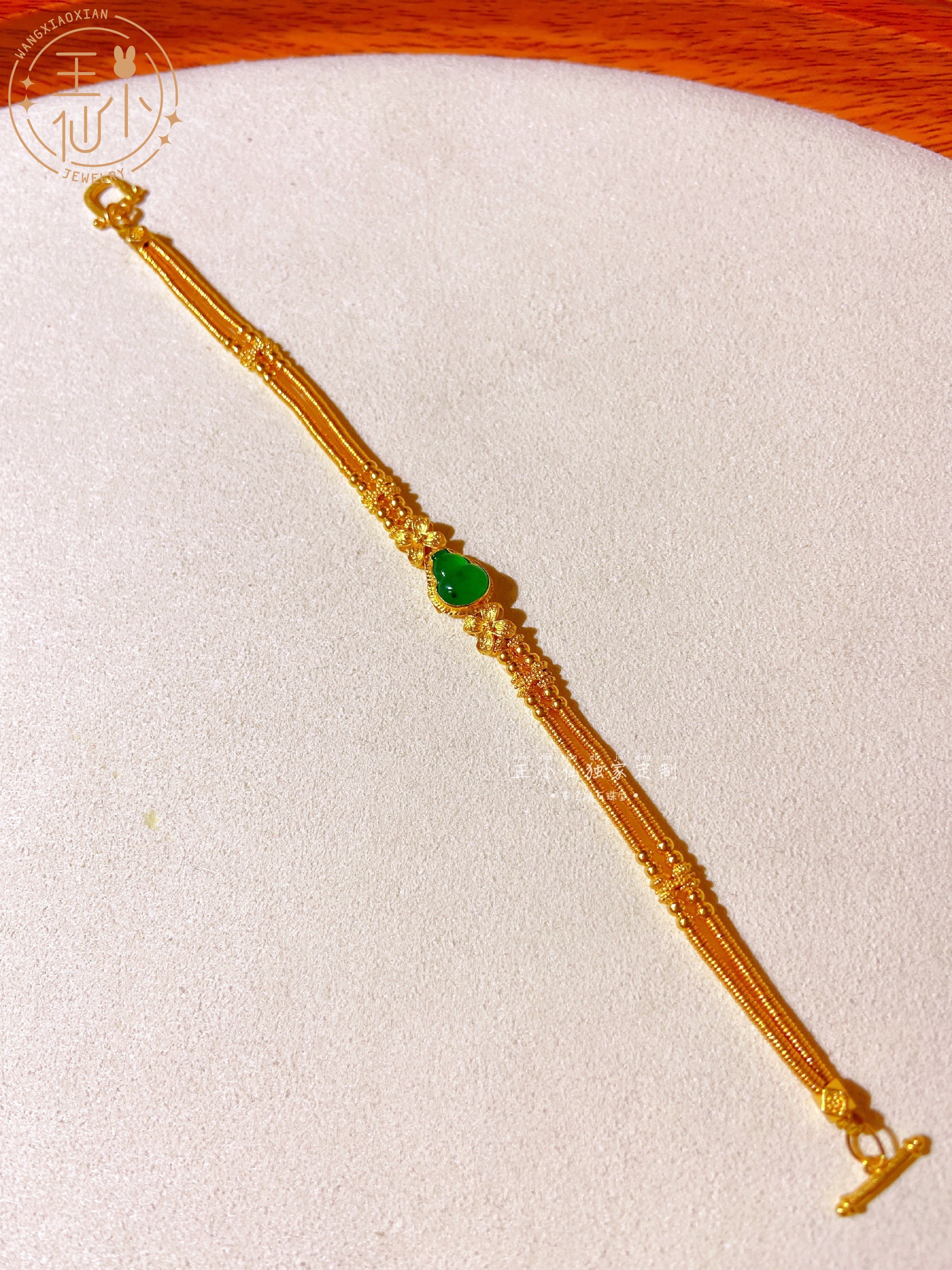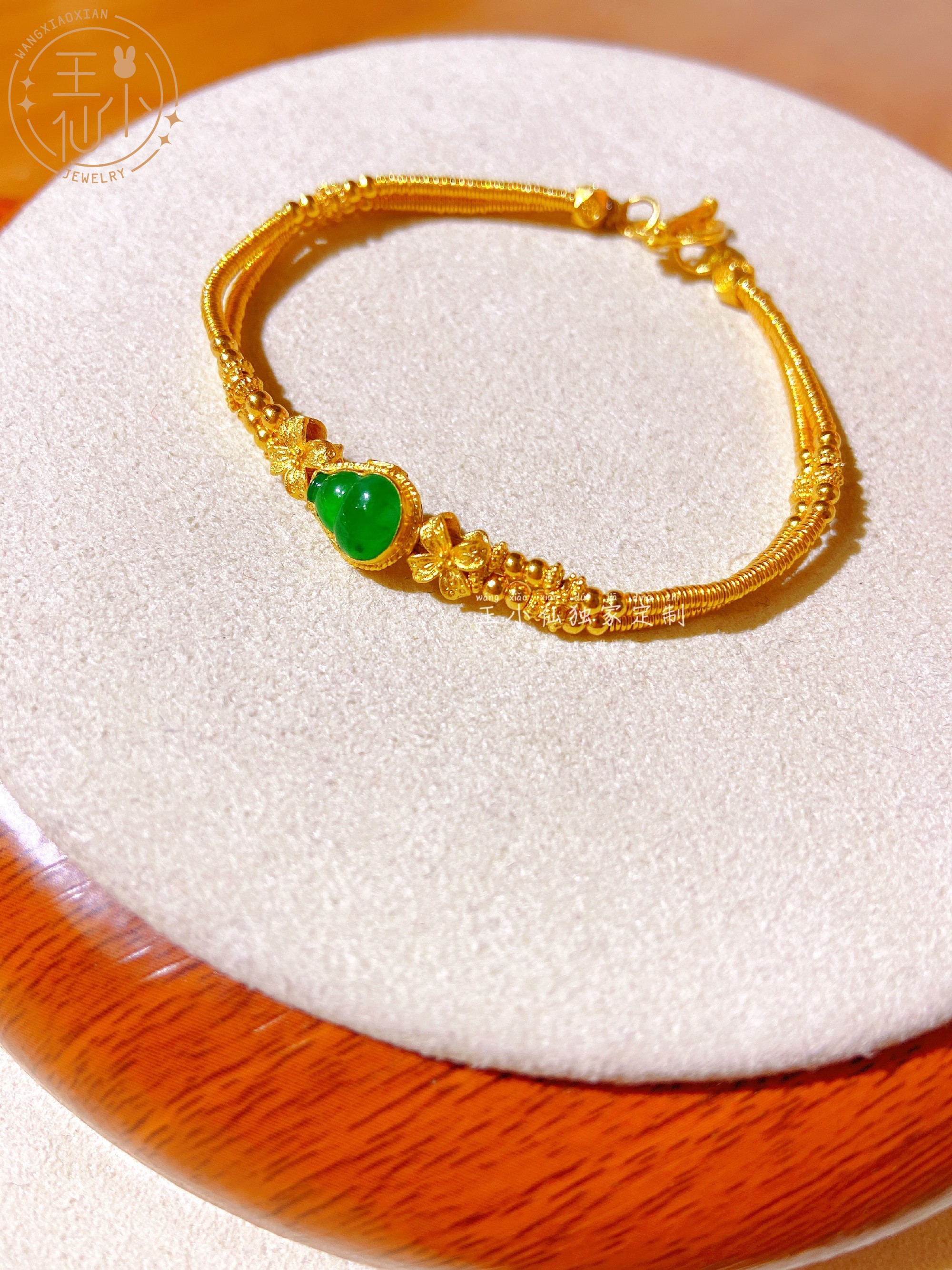 999足金 手工古法金 天然缅甸翡翠 葫芦 双层 金圈圈 手链