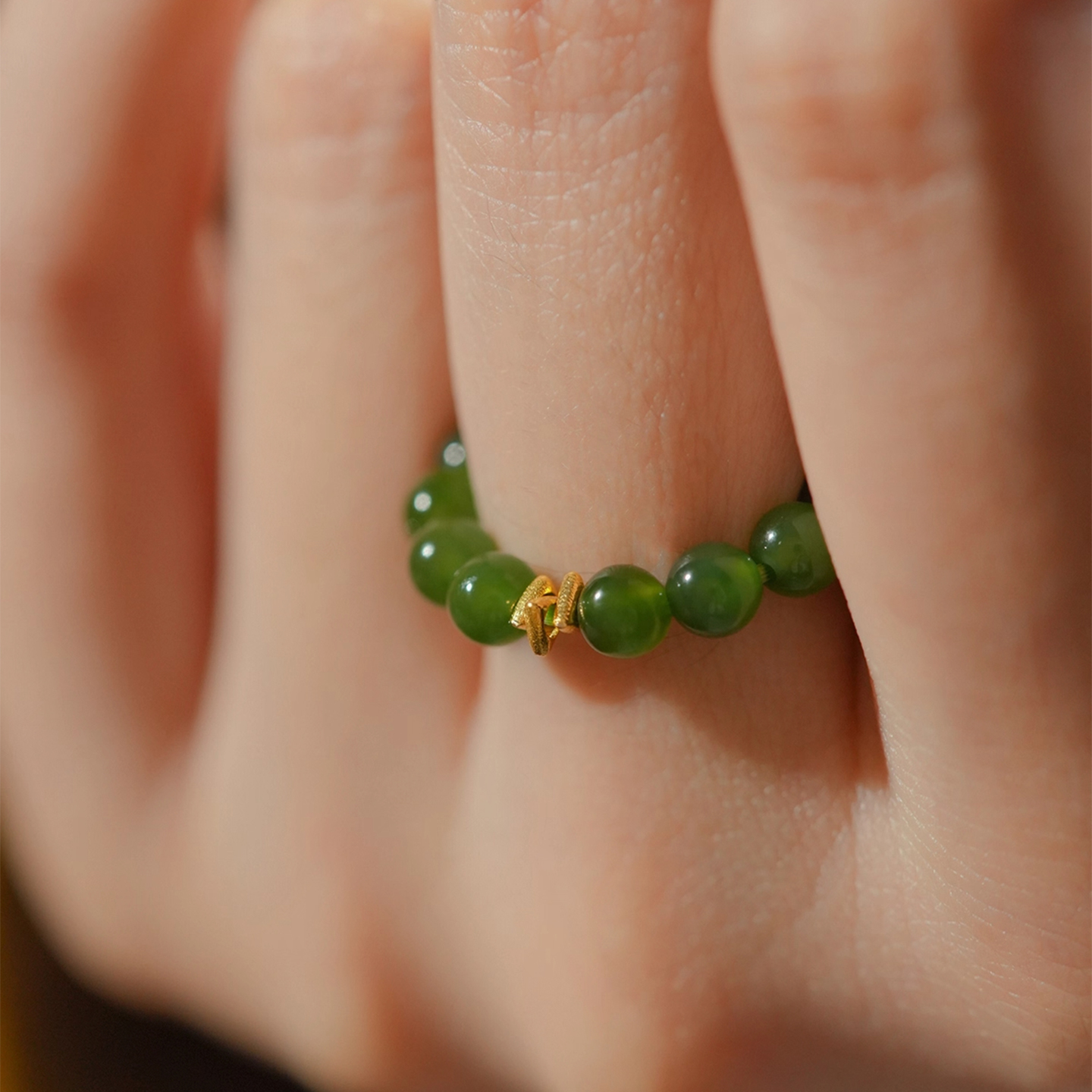 和田玉碧玉戒指玉石绿色串珠古风指环新中式尾戒18k金小米珠翠晴