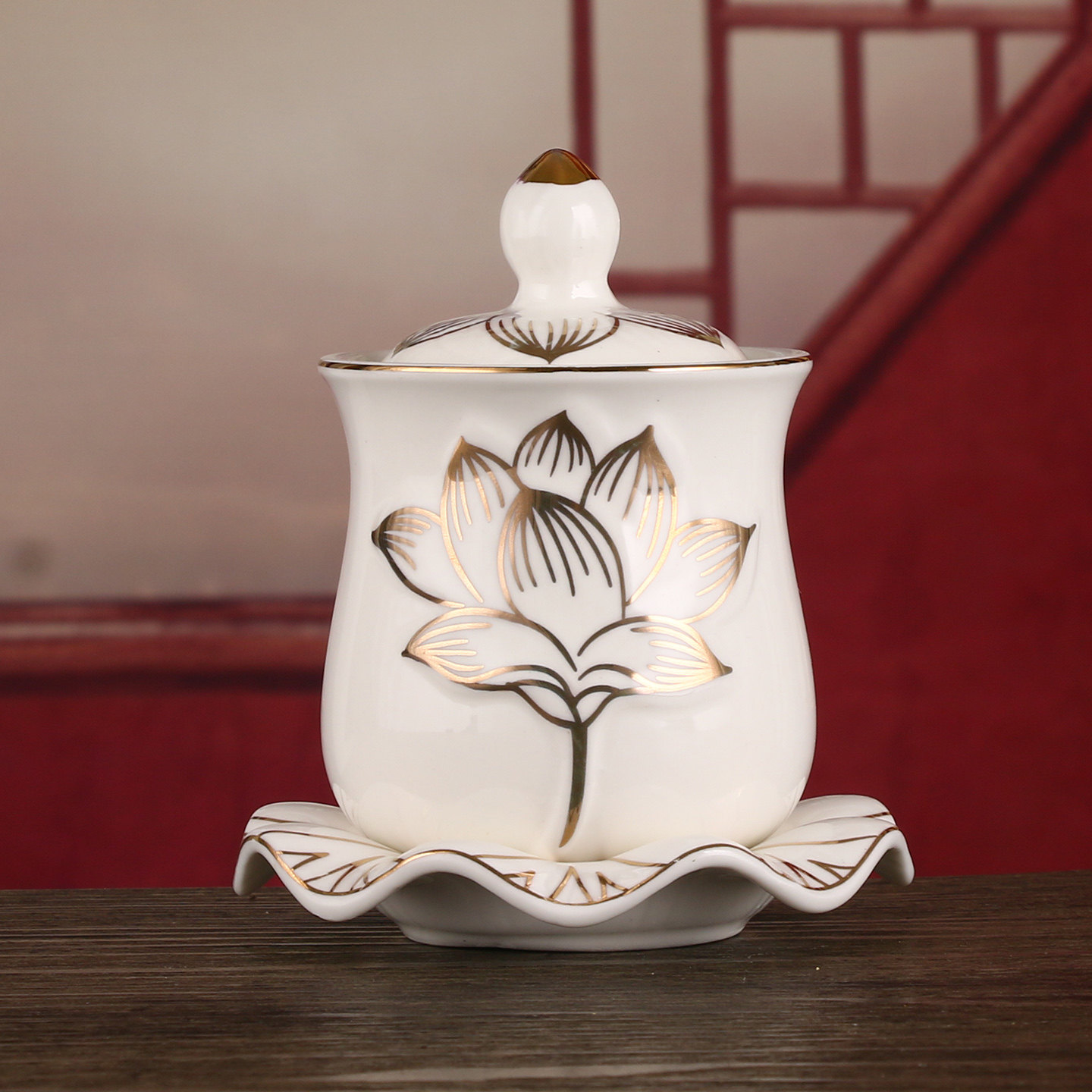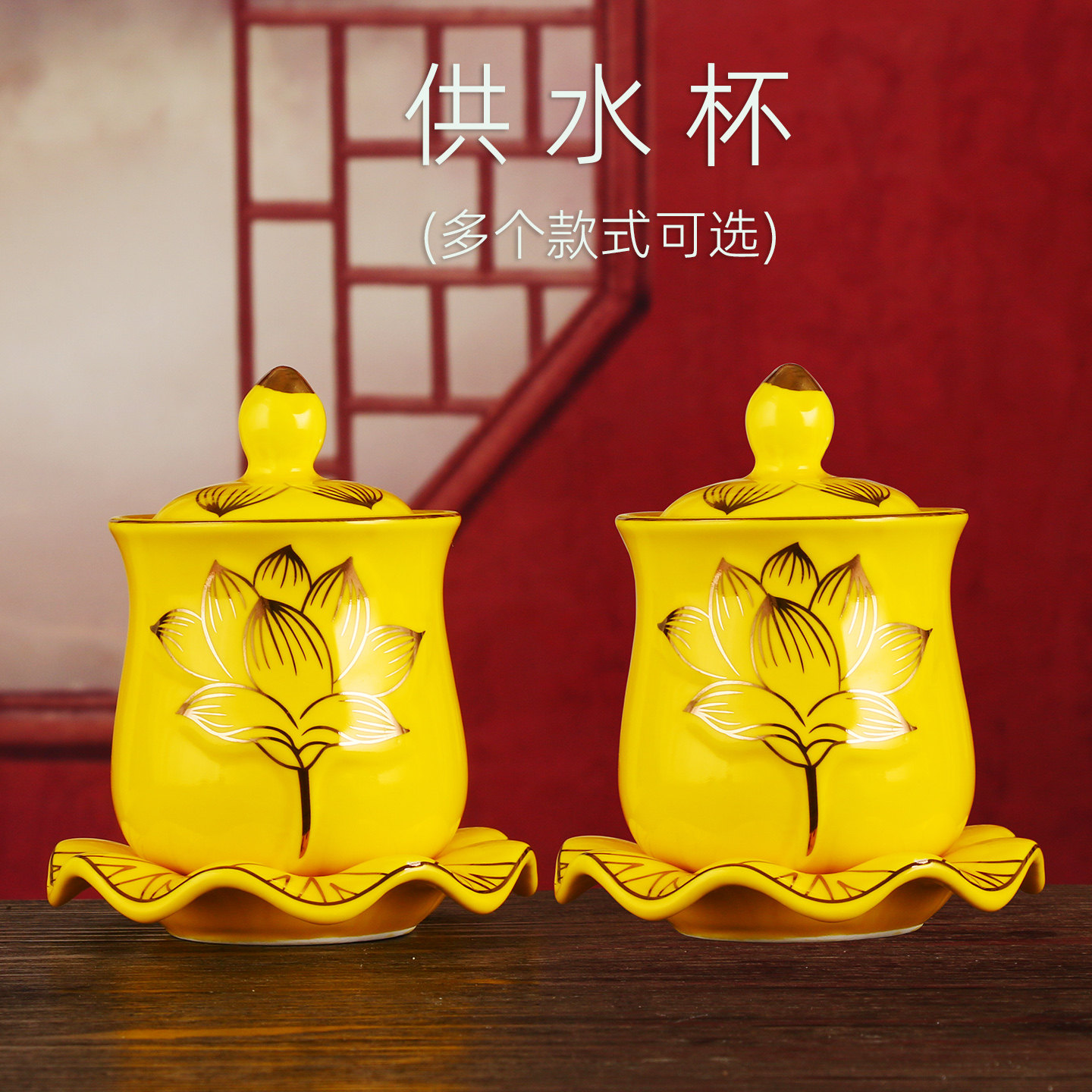陶瓷供水杯大号家用莲花供佛杯佛具佛堂供奉用品观音黄色带盖摆件