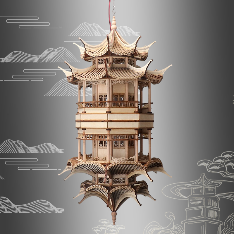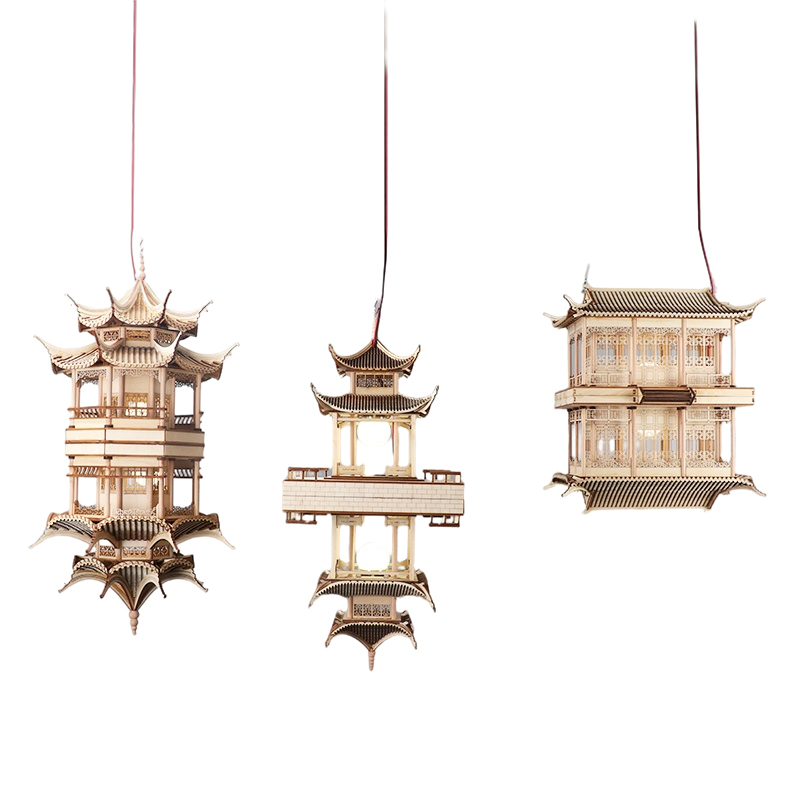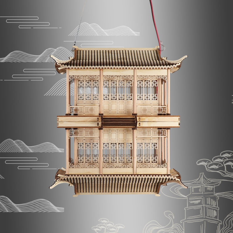 新中式创意实木古建筑模型亭子造景悬挂镜像吊饰样板房酒店摆件