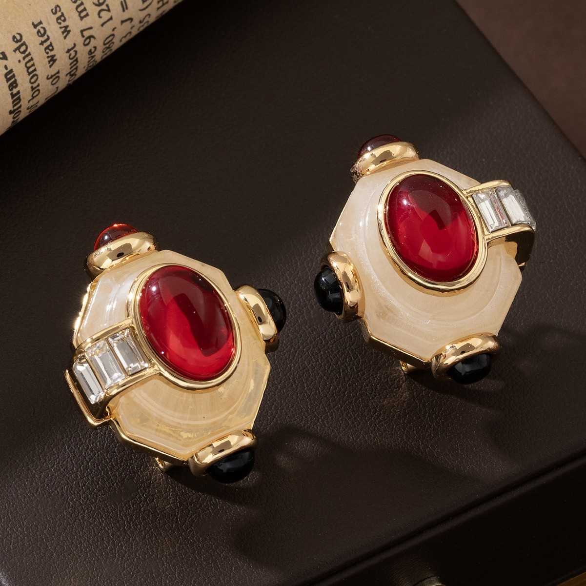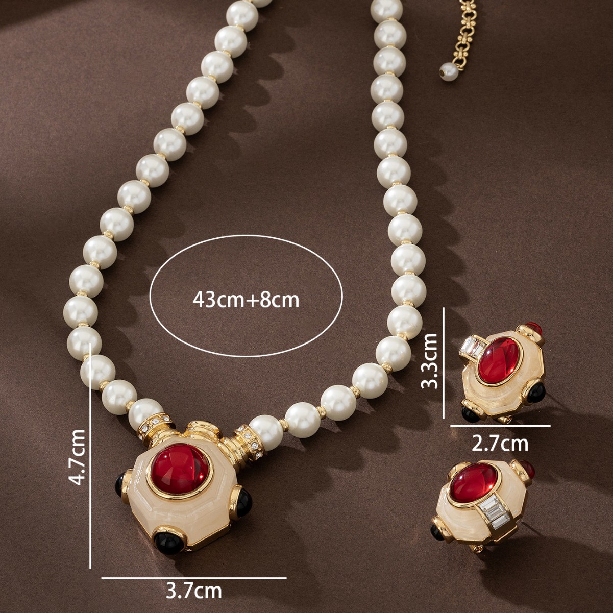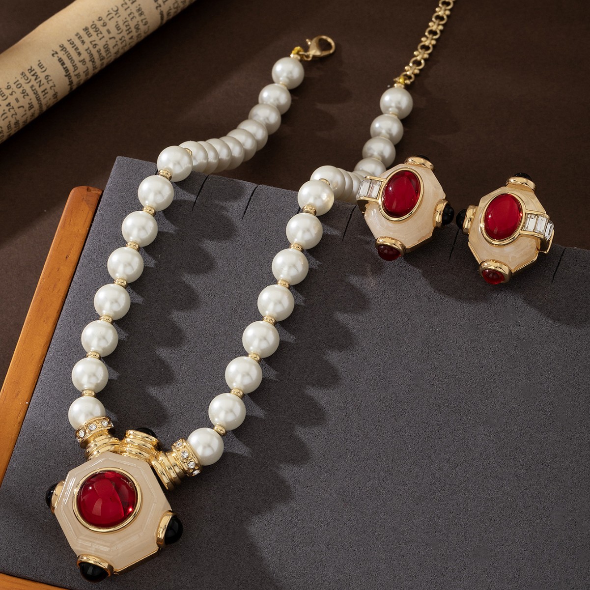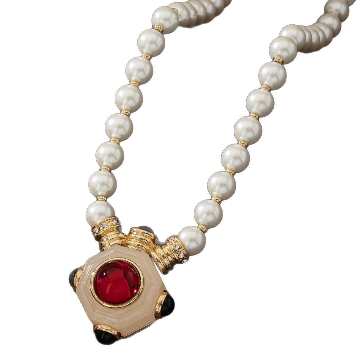复古红宝石中世纪设计感珍珠项链套装中古vintage复古民族风耳环