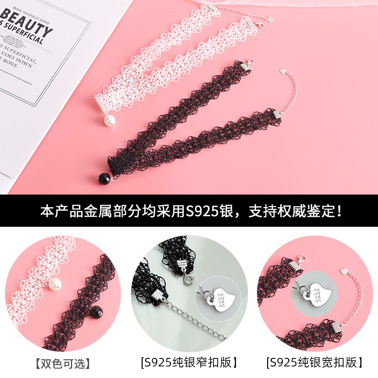 s925纯银蕾丝花边choker颈链日韩项链女锁骨链珍珠项圈百搭颈带潮