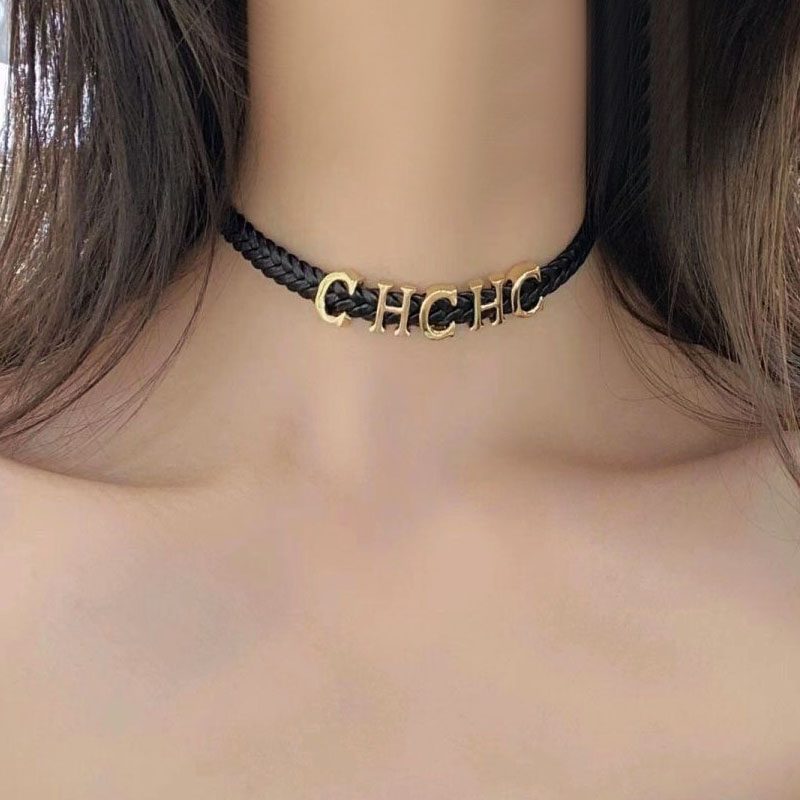 短款choker皮革项圈女金色字母编织黑色项链小众高级感锁骨颈链潮